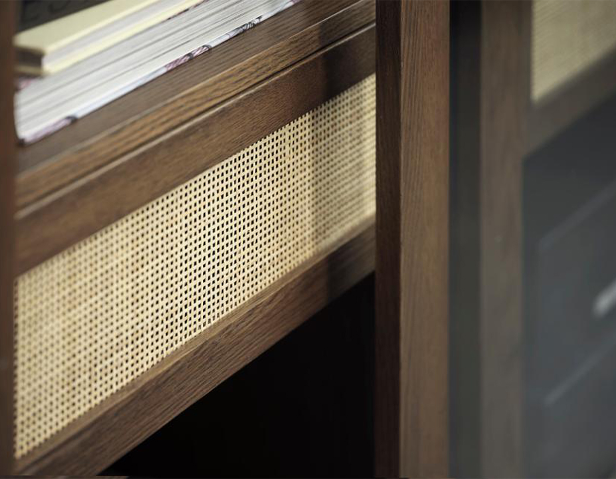 • Cabinet has 2 doors, shelves behind them and two drawer, the front panel of the drawer is decorated with rattan