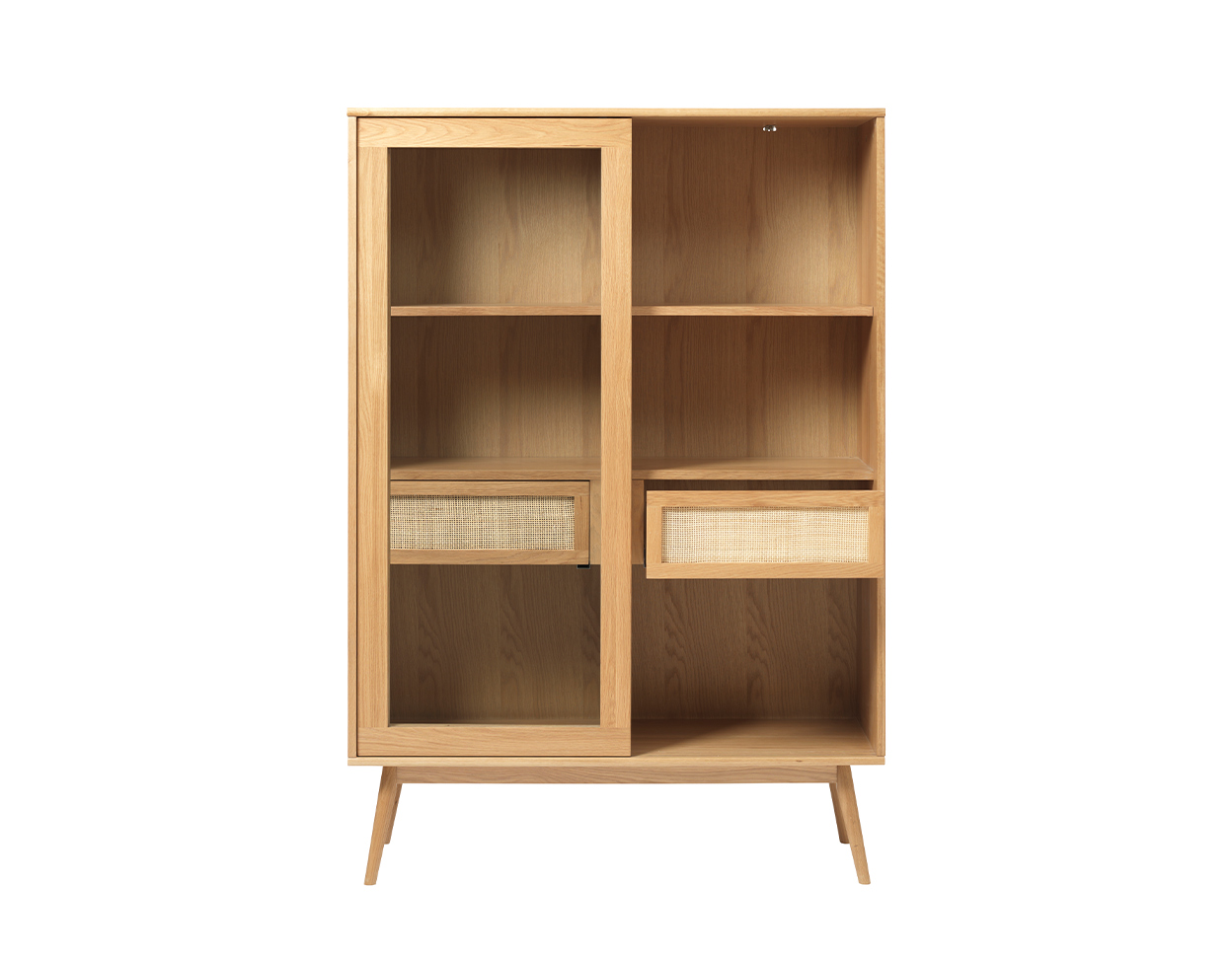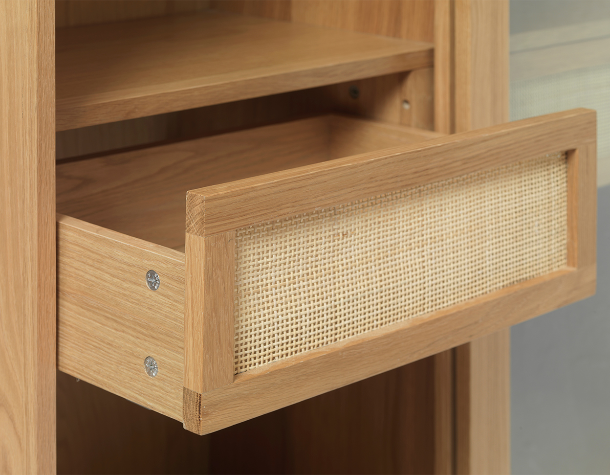 • Cabinet has 2 doors, shelves behind them and two drawer, the front panel of the drawer is decorated with rattan