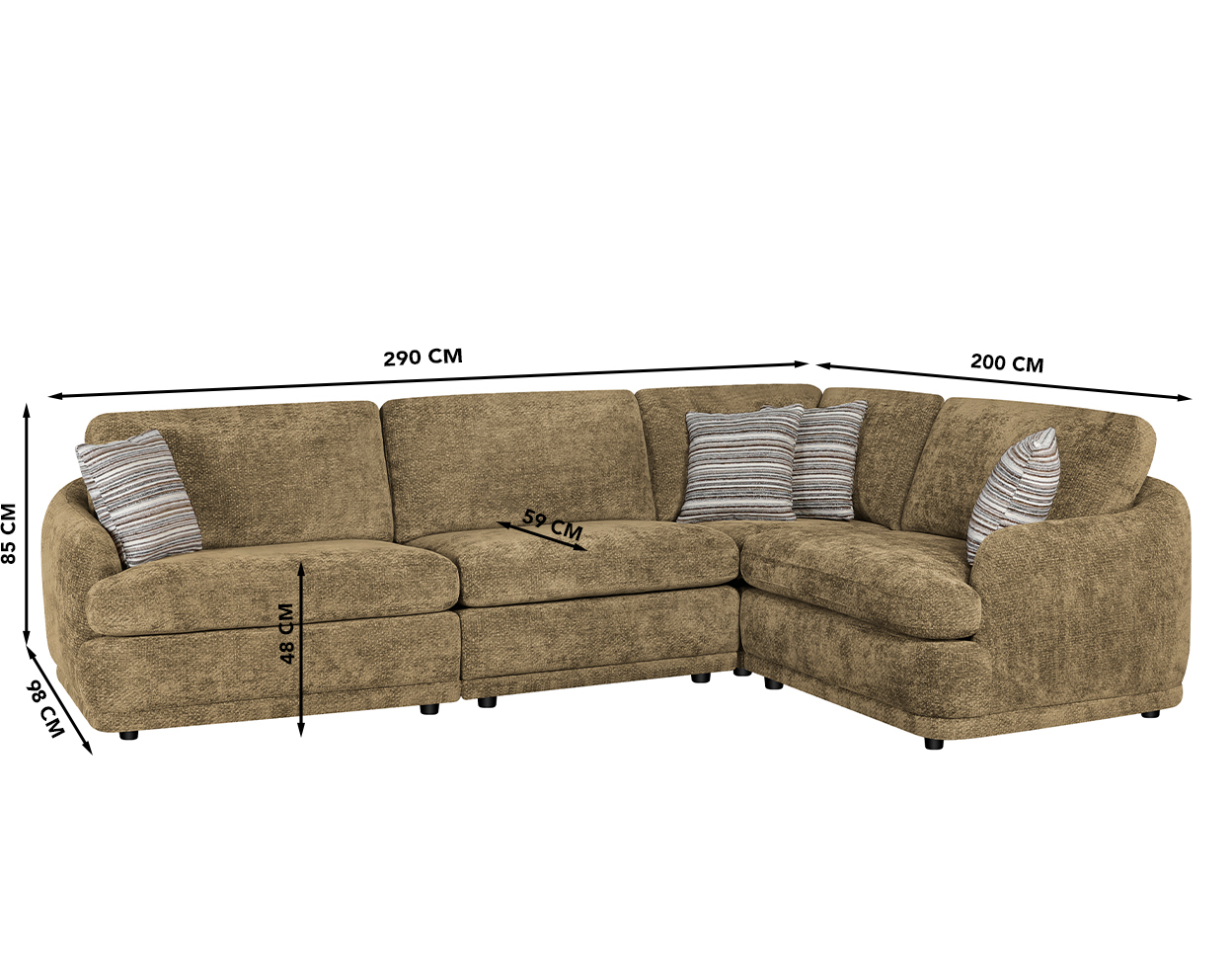 Dimensions (cm): 290 (W) x 98/200 (D) x 85 (H), seat height 48 cm, -depth 59 cm