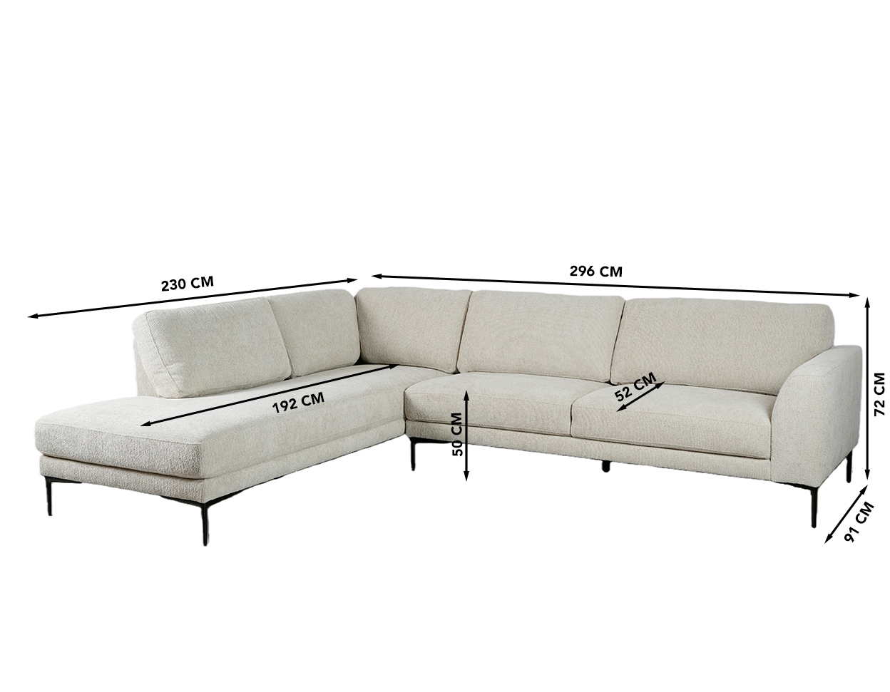 Dimensions (cm): 296 (W) x 230/91 (D) x 72 (H), seat height is 50 cm and seat depth 52/192 cm