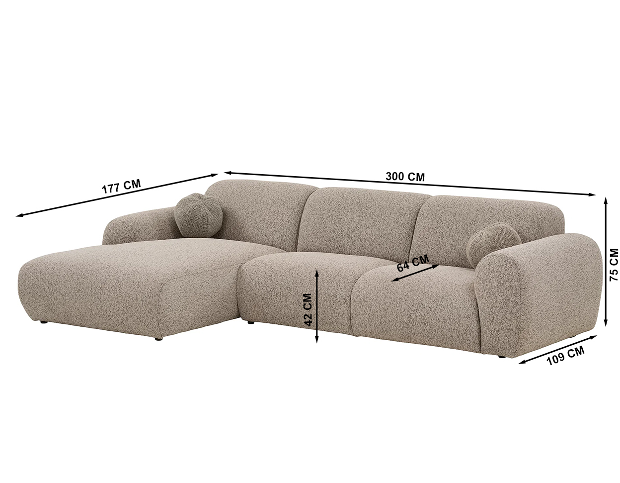 Dimensions (cm): 300 (W) x 177/109 (D) x 75 (H), seat height 42 cm, depth 64 cm