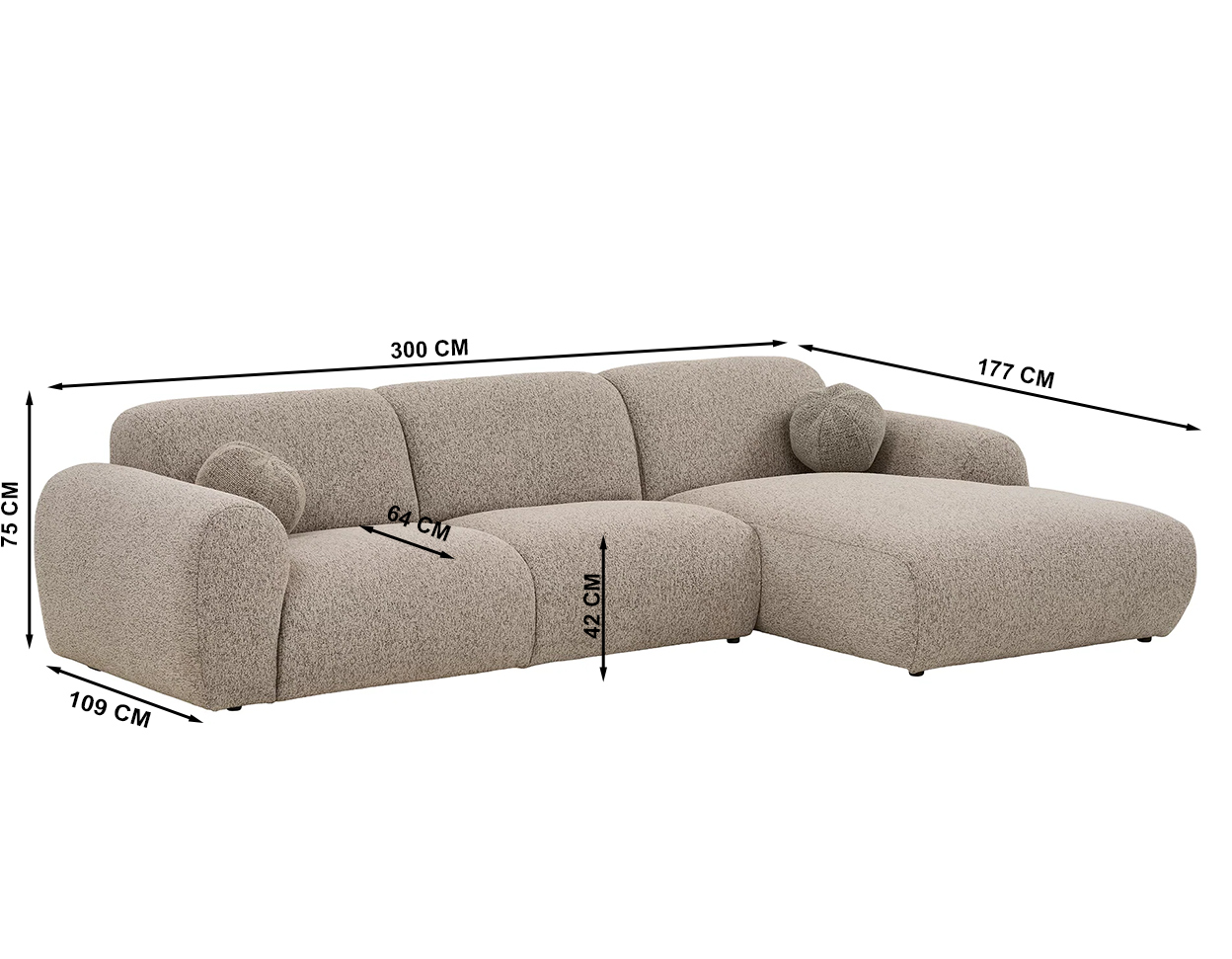 Dimensions (cm): 300 (W) x 107/177 (D) x 75 (H), seat height 42 cm, depth 64 cm