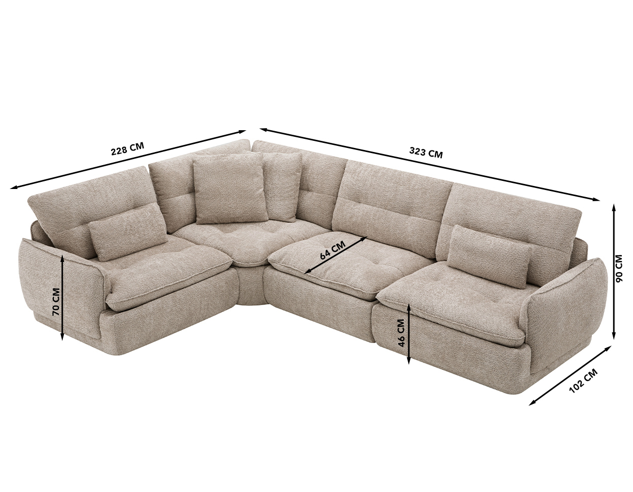 Dimensions (cm): 323 (W) x 228/102 (D) x 90/70 (H), seating height 46 cm, -depth 65 cm