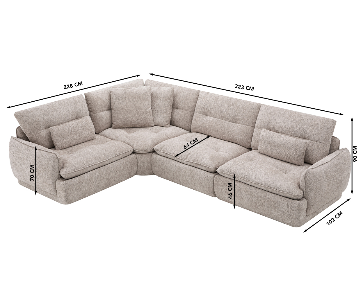 Dimensions (cm): 323 (W) x 228/102 (D) x 90/70 (H), seating height 46 cm, -depth 65 cm