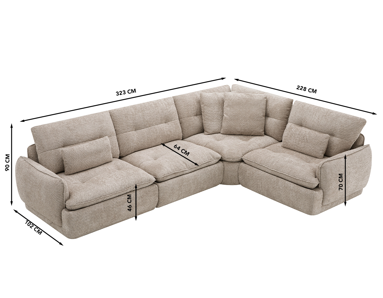 Dimensions (cm): 323 (W) x 228/102 (D) x 90/70 (H), seating height 46 cm, -depth 65 cm