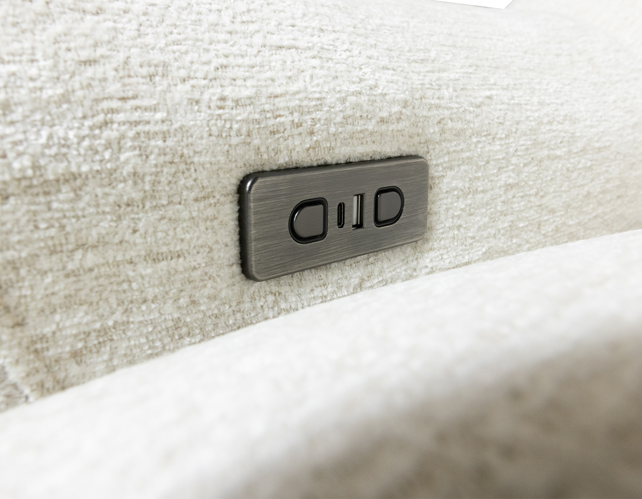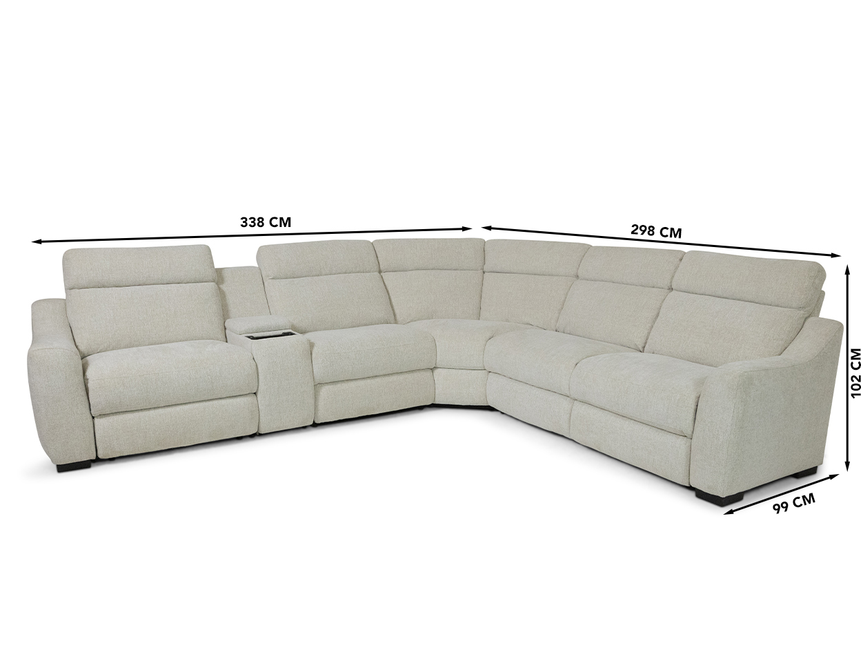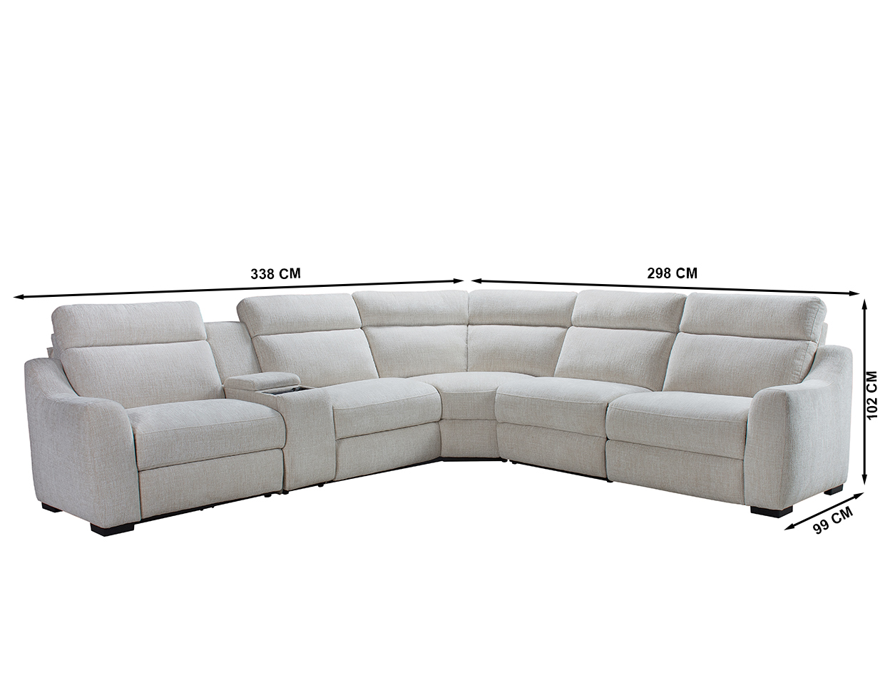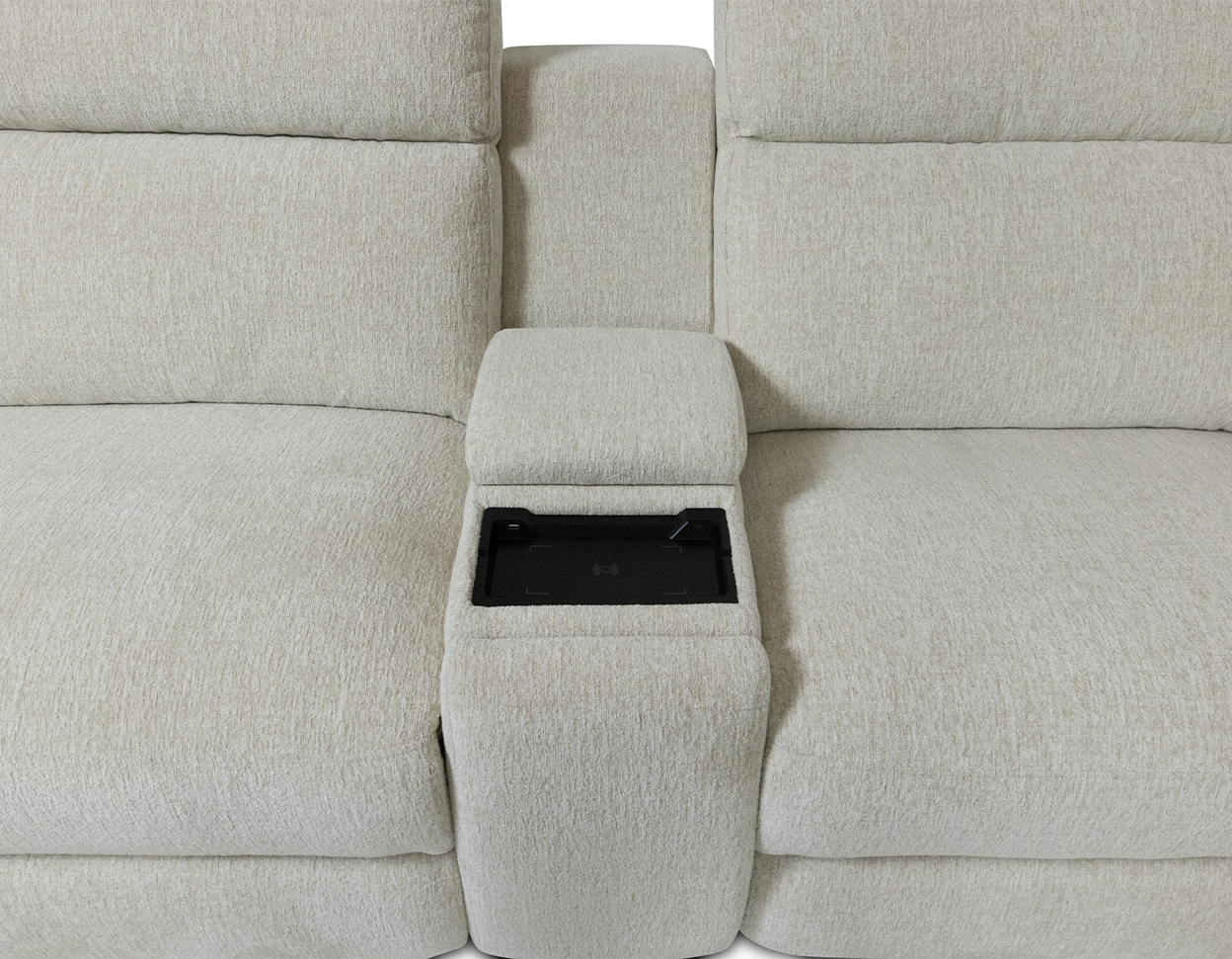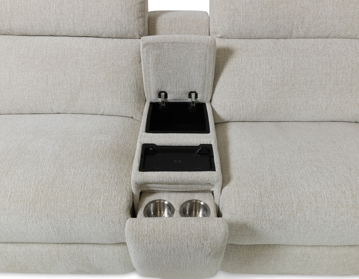 • The corner sofa has a console module with storage, cup holders and a wireless charging base