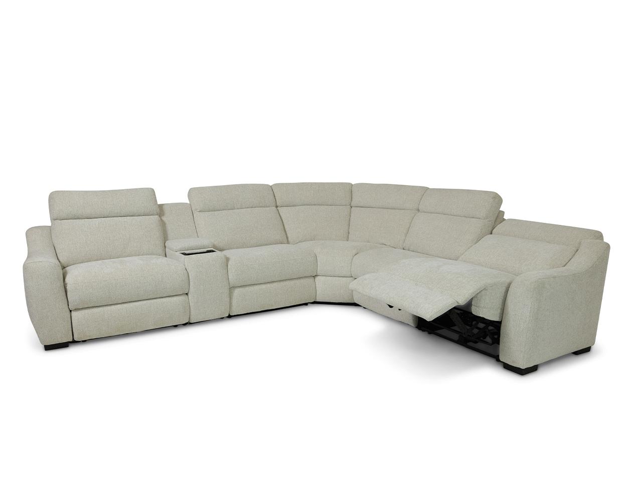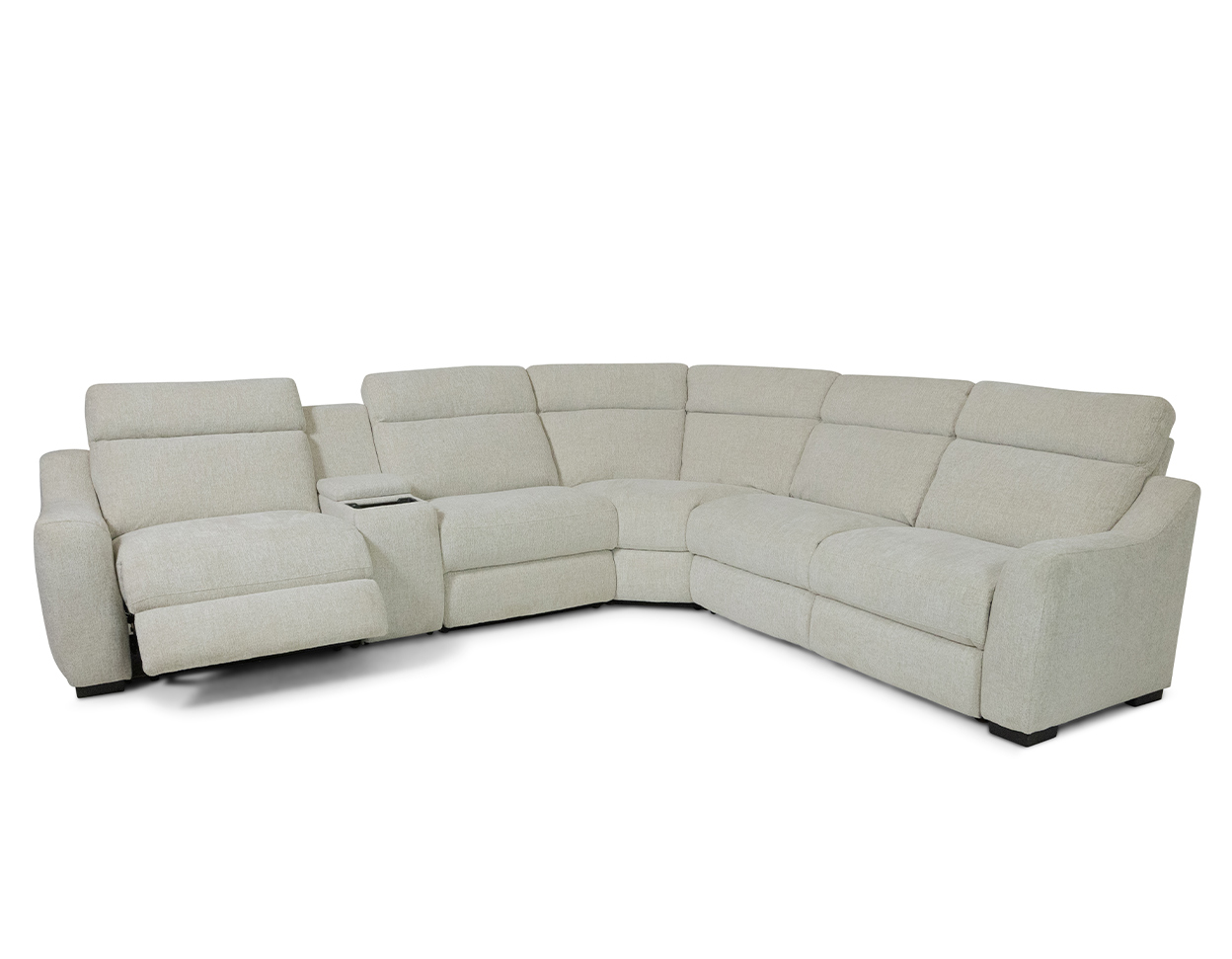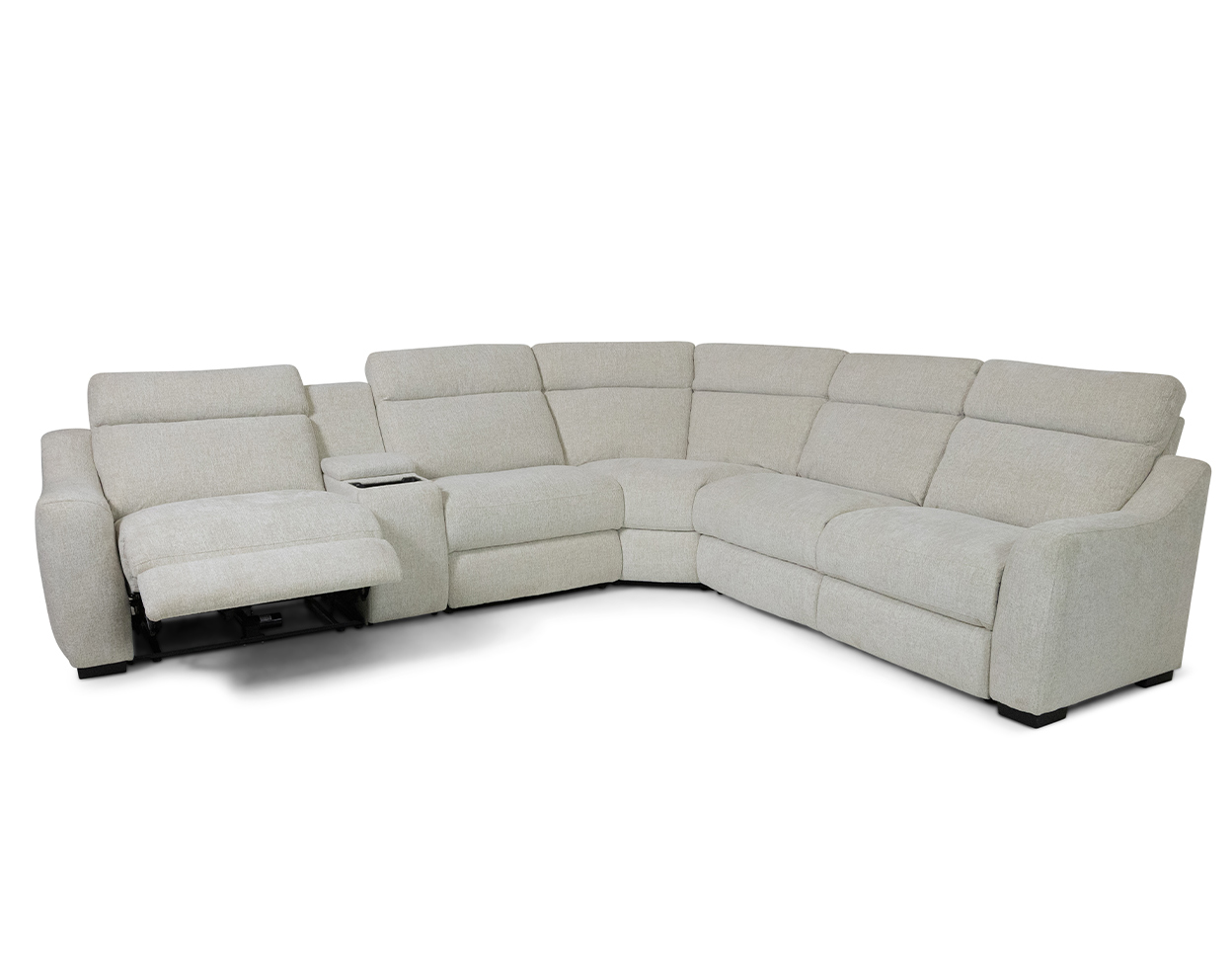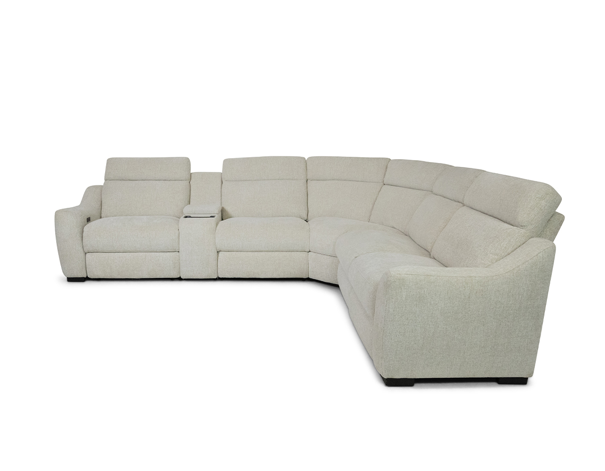 • The corner sofa has a console module with storage, cup holders and a wireless charging base