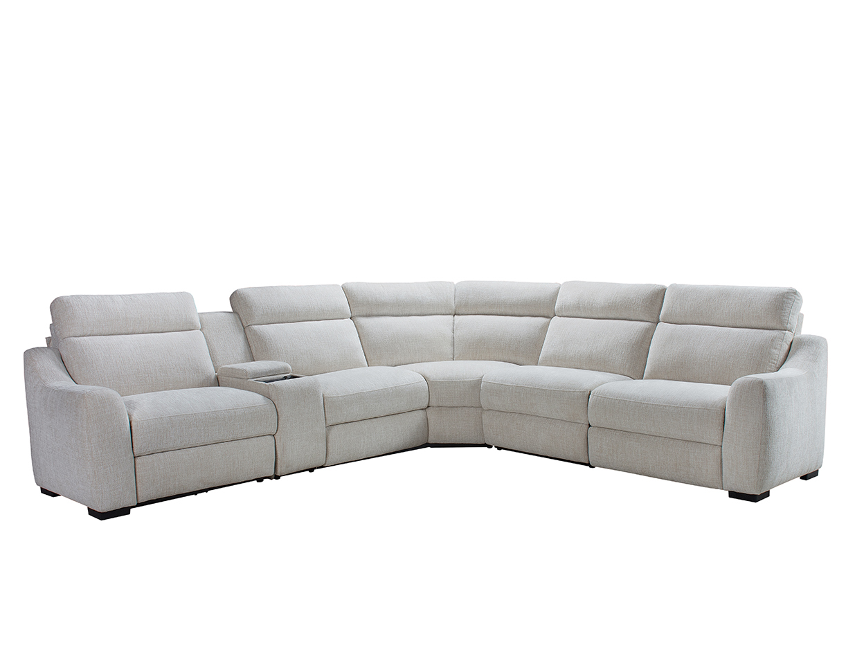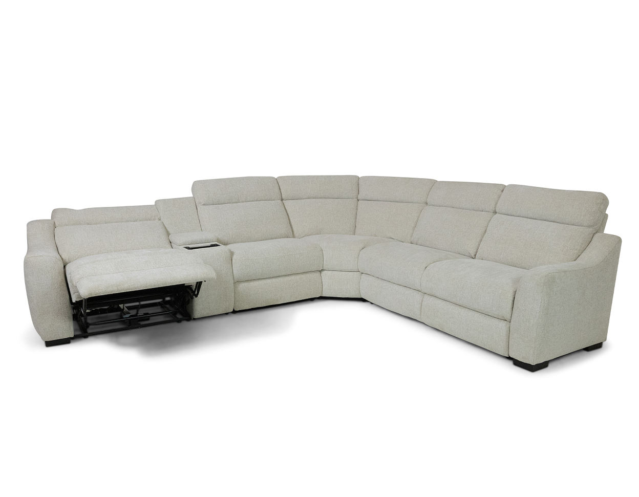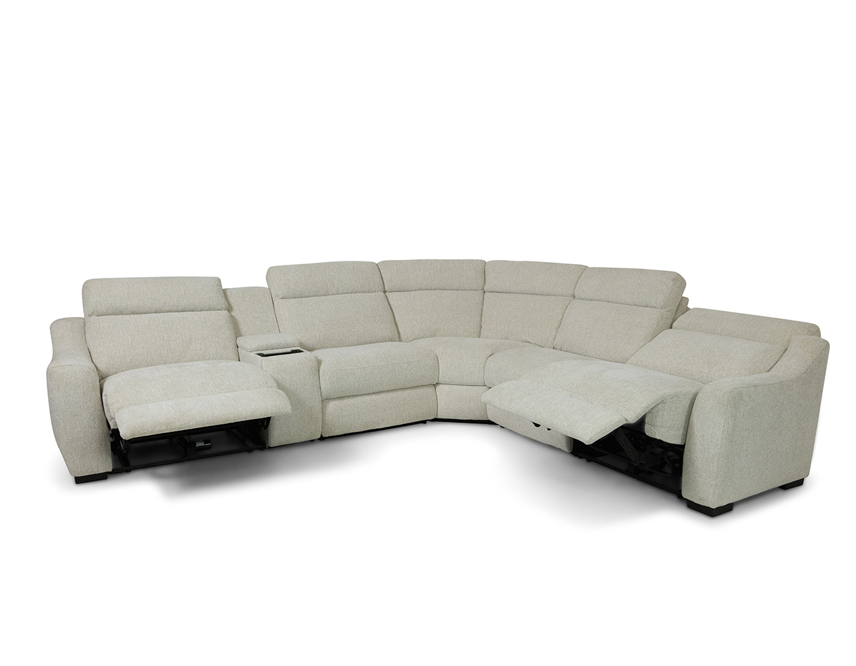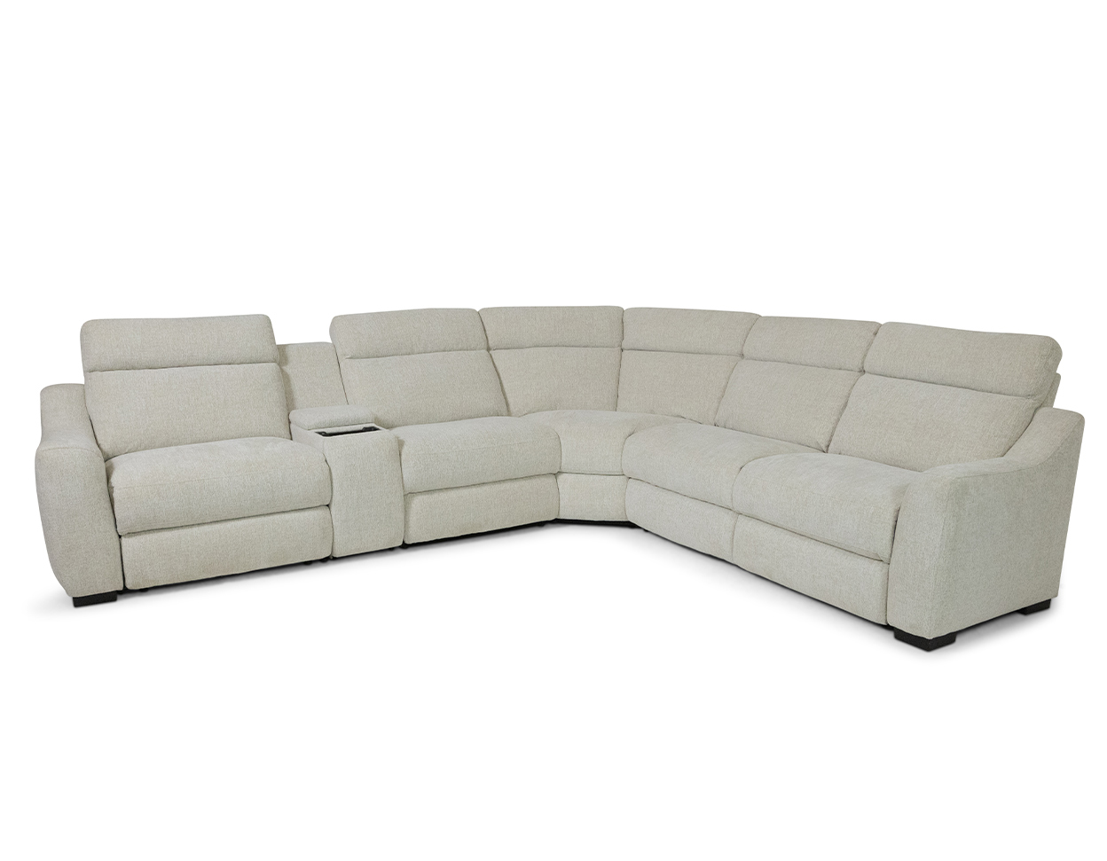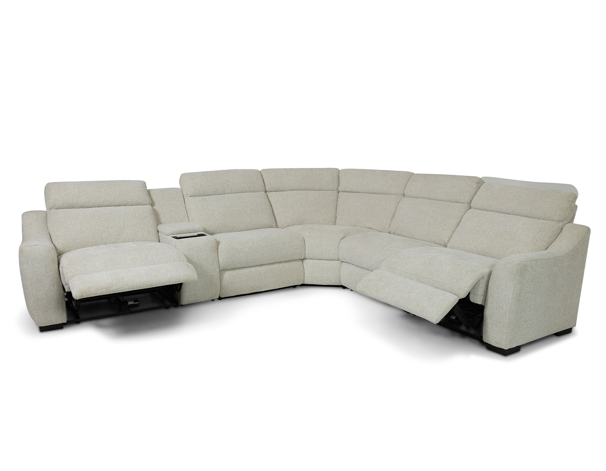• The corner sofa has a console module with storage, cup holders and a wireless charging base