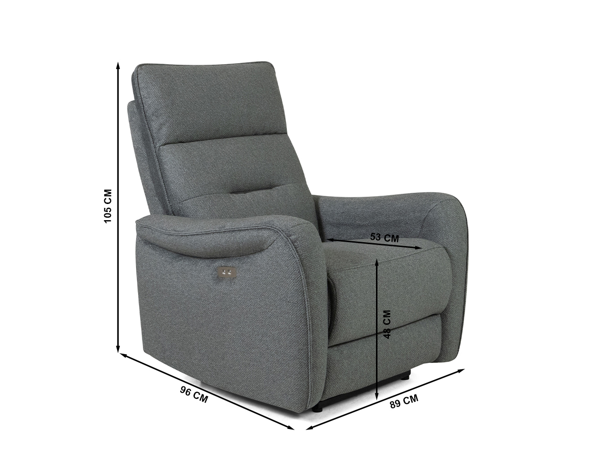Dimensions (cm): 89 (W) x 96 (D) x 105 (H), seating height 48 cm, -depth 53 cm
