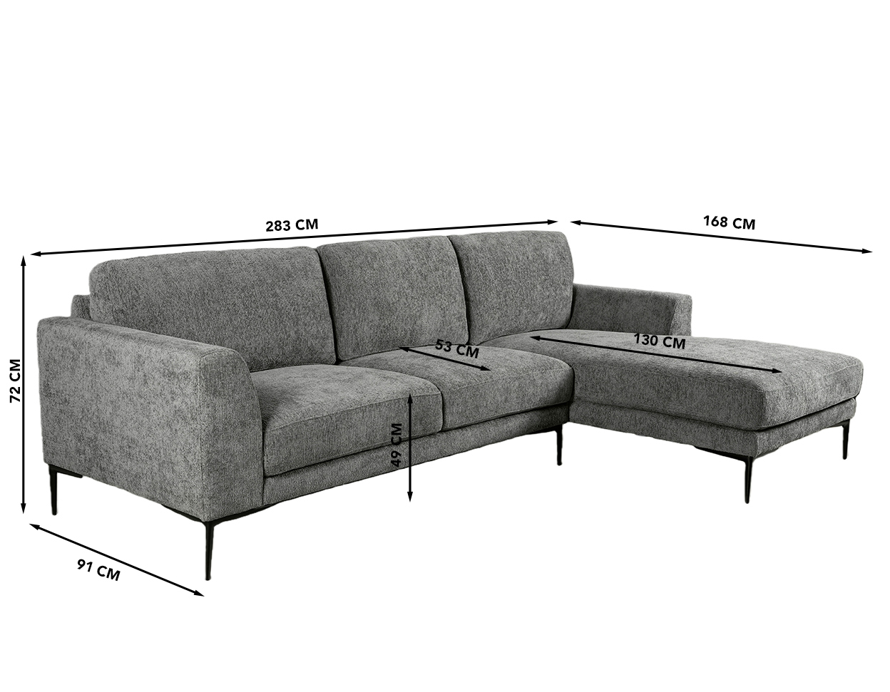 Dimensions (cm): 283 (W) x 91/168 (D) x 72 (H), seat height is 49 cm and seat depth 53/130 cm