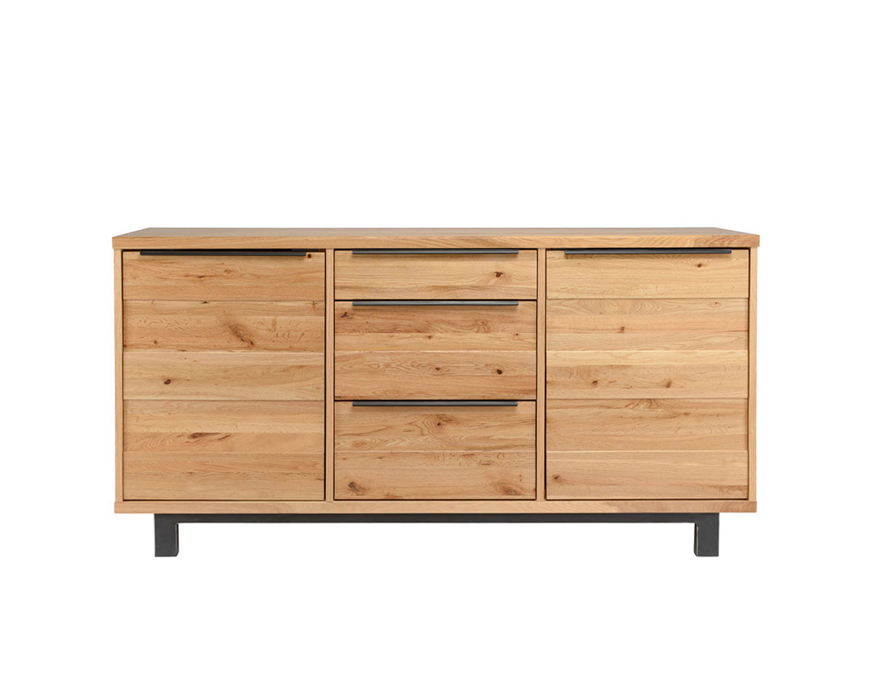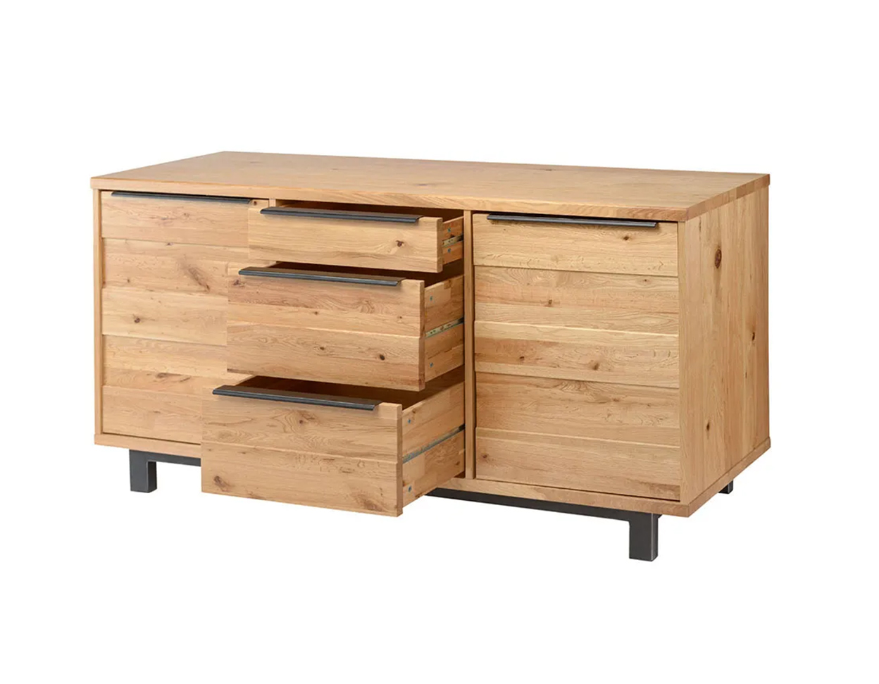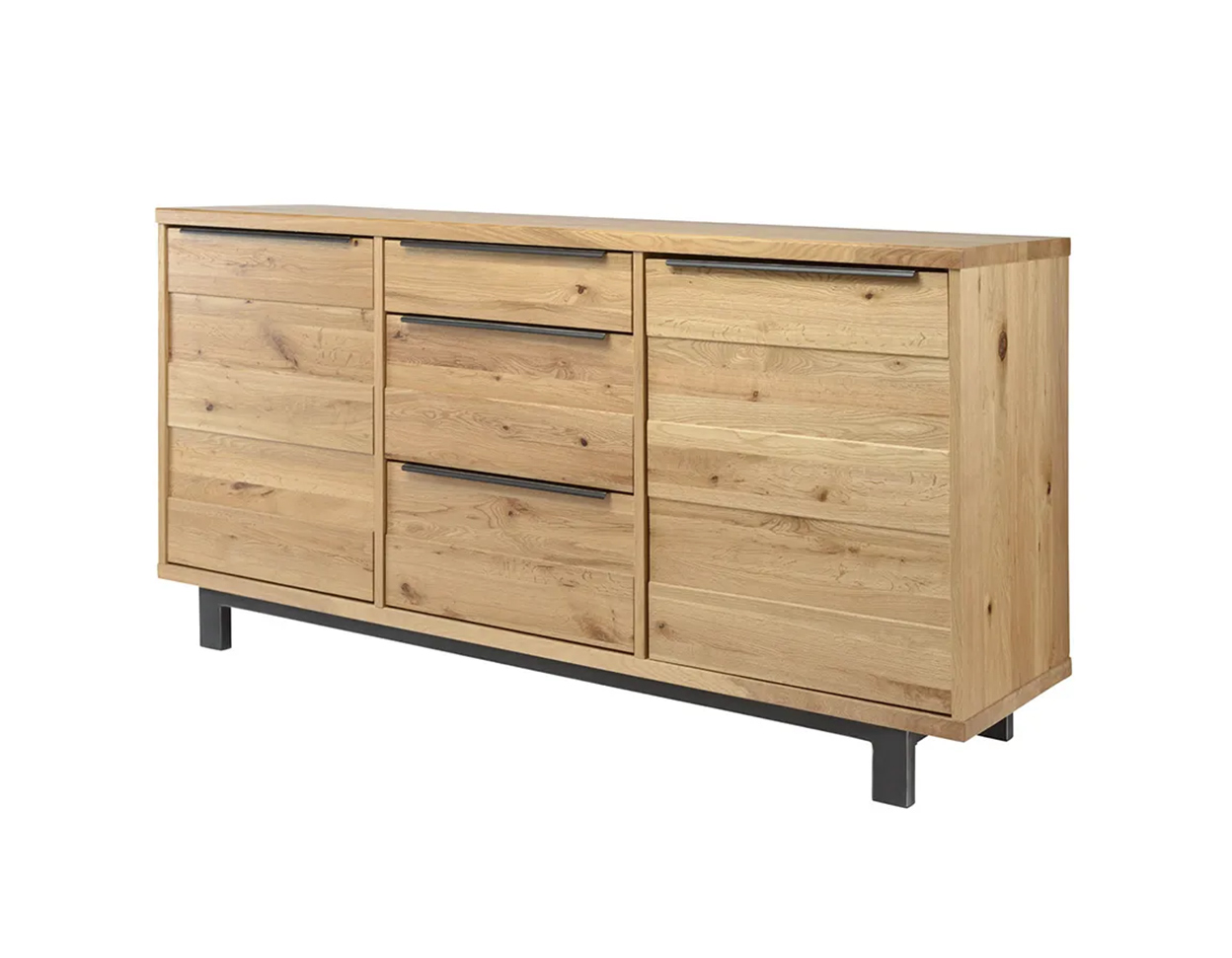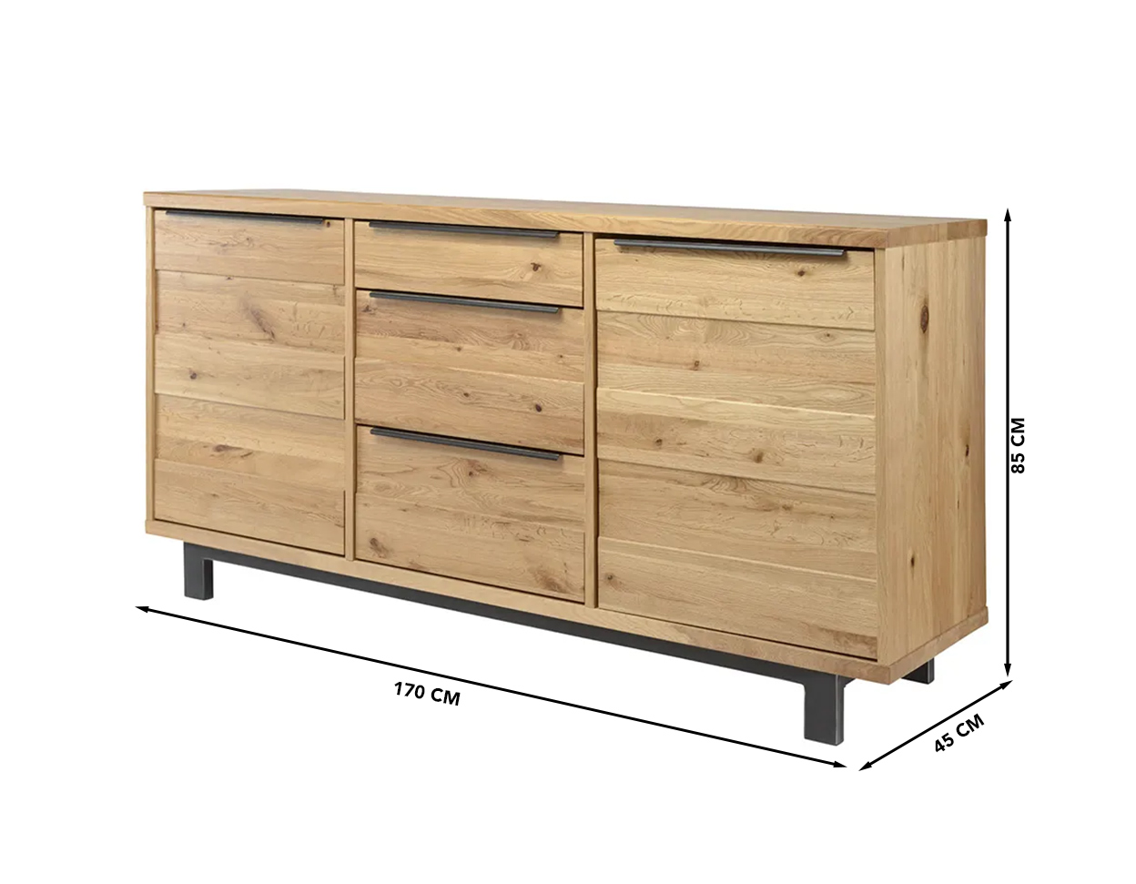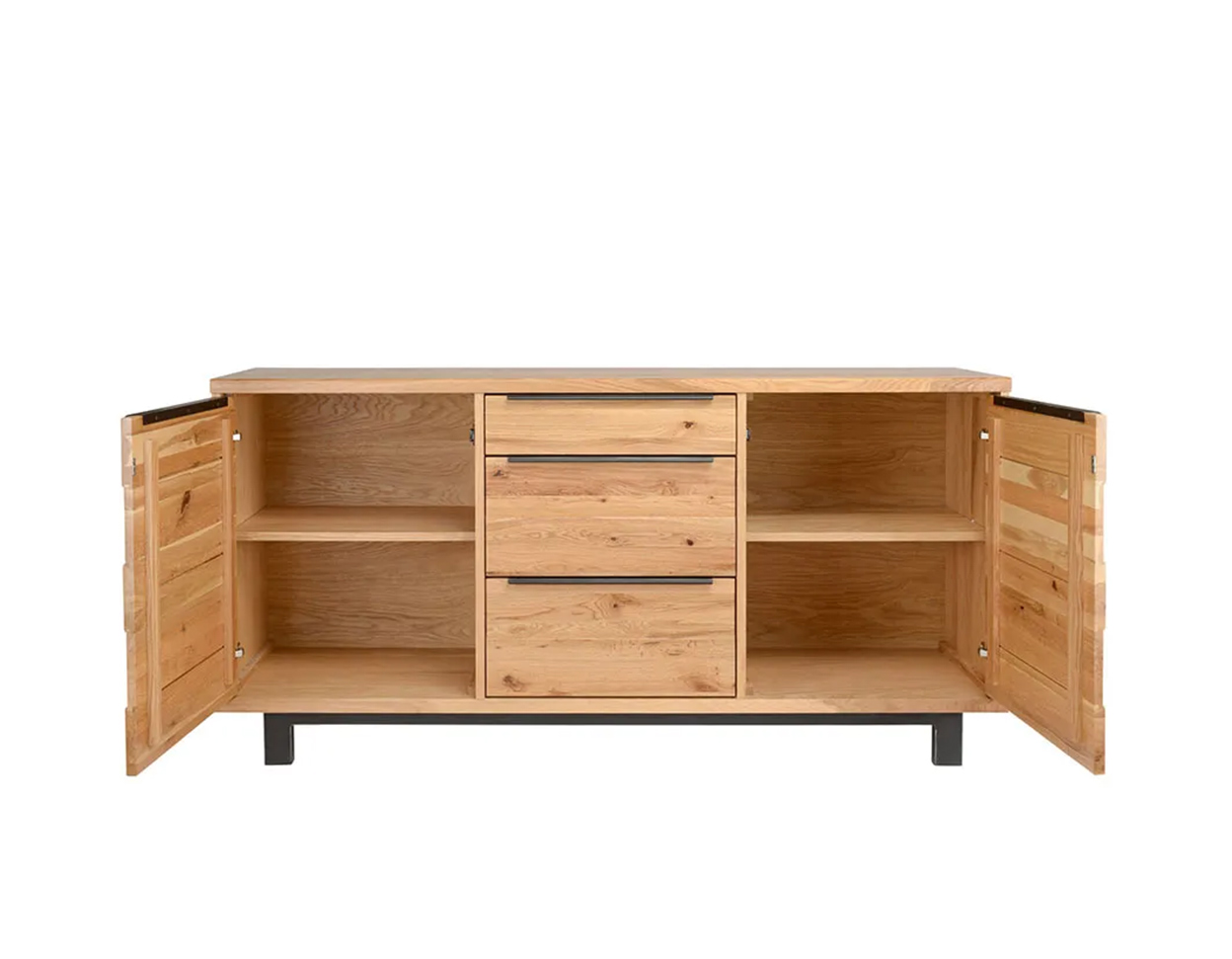 • Sideboard has three drawers and two cabinets with doors, shelves behind doors