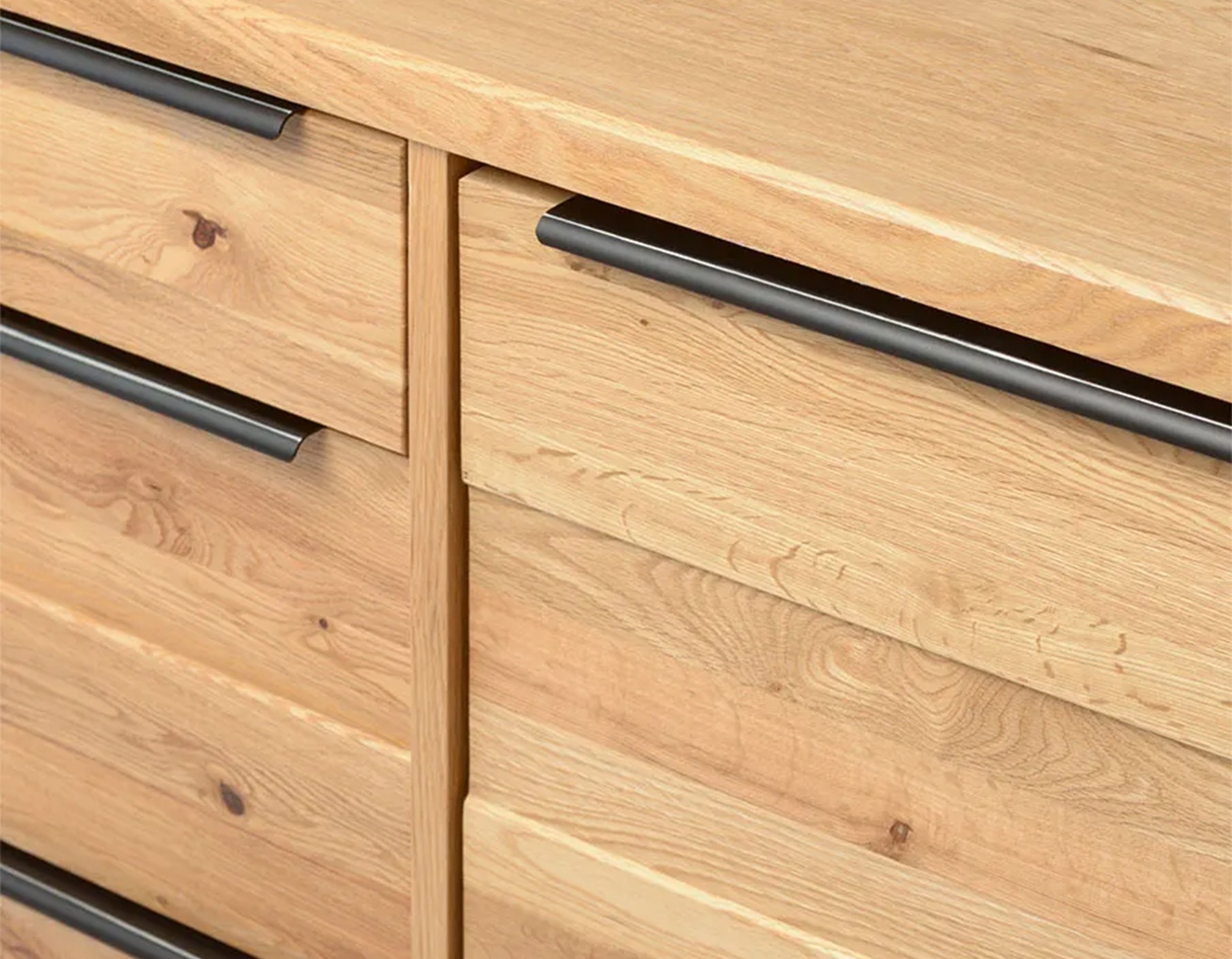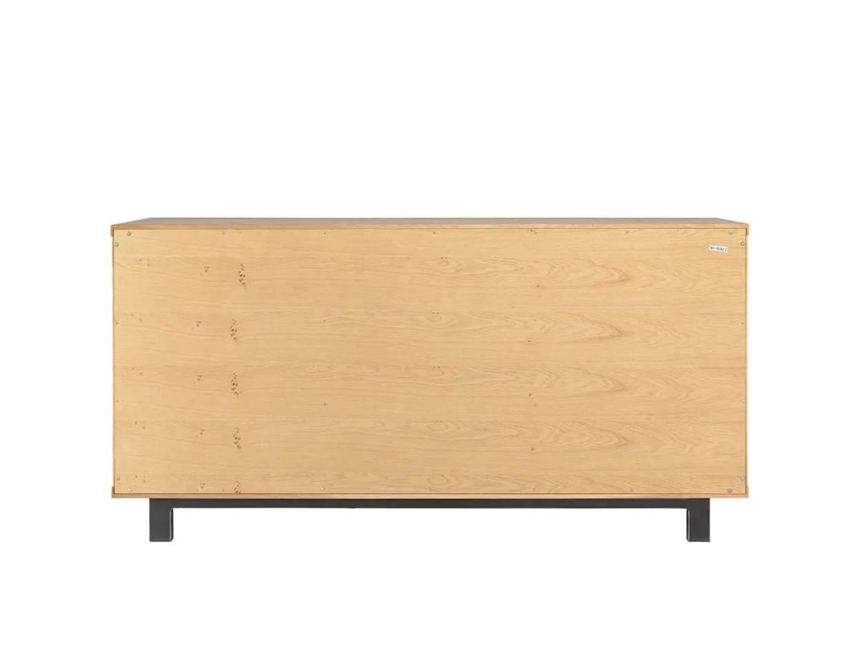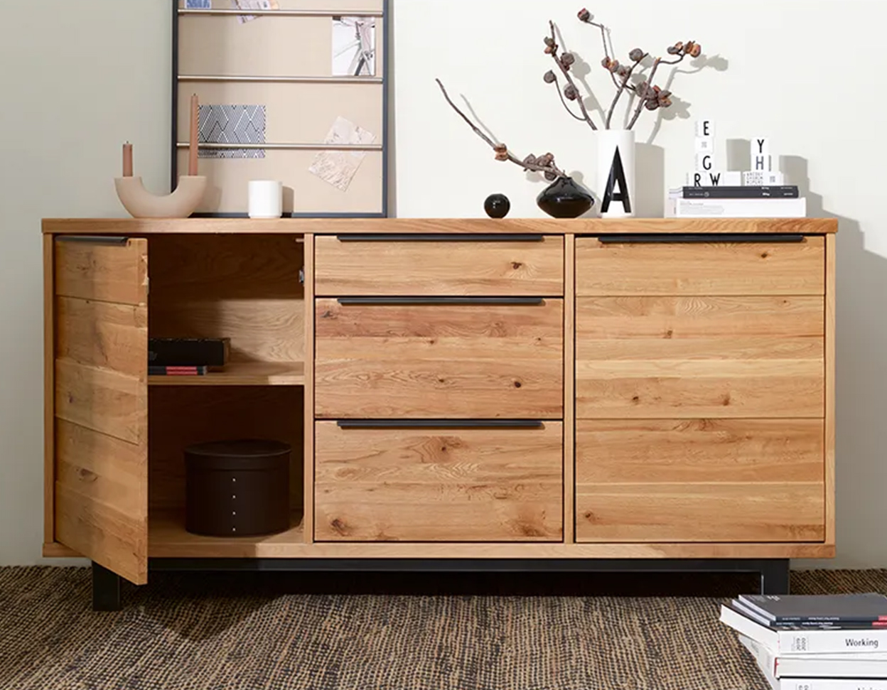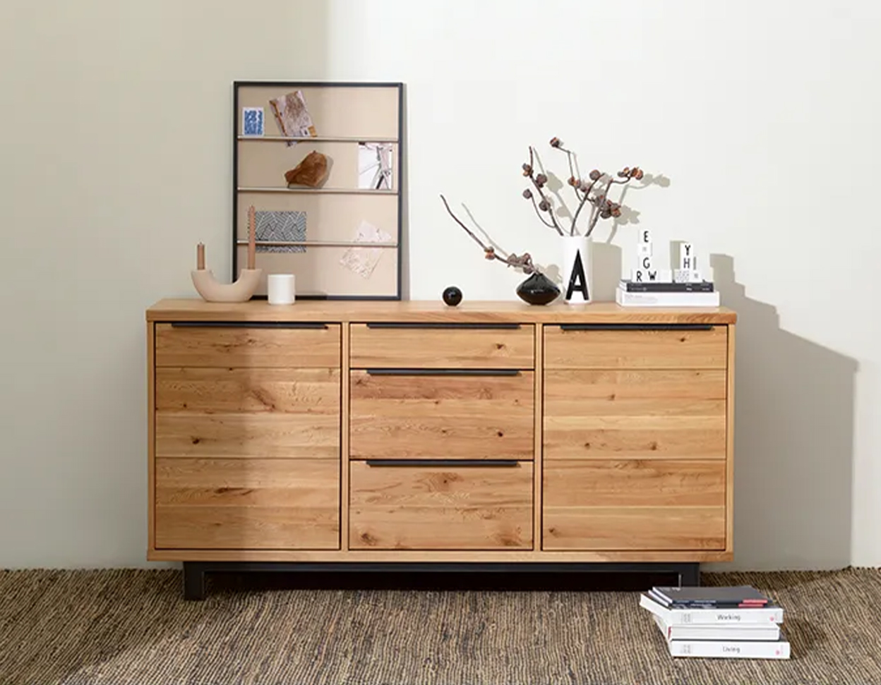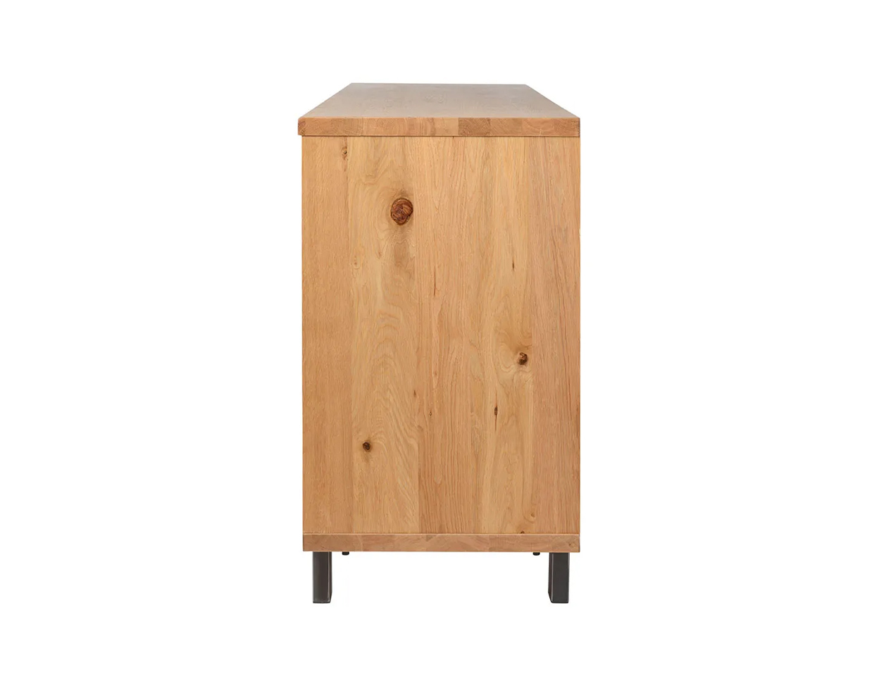 • Sideboard has three drawers and two cabinets with doors, shelves behind doors
