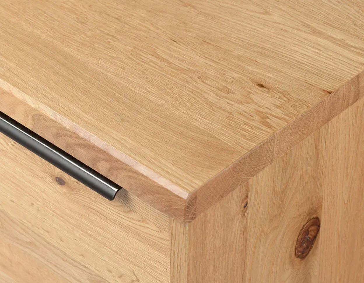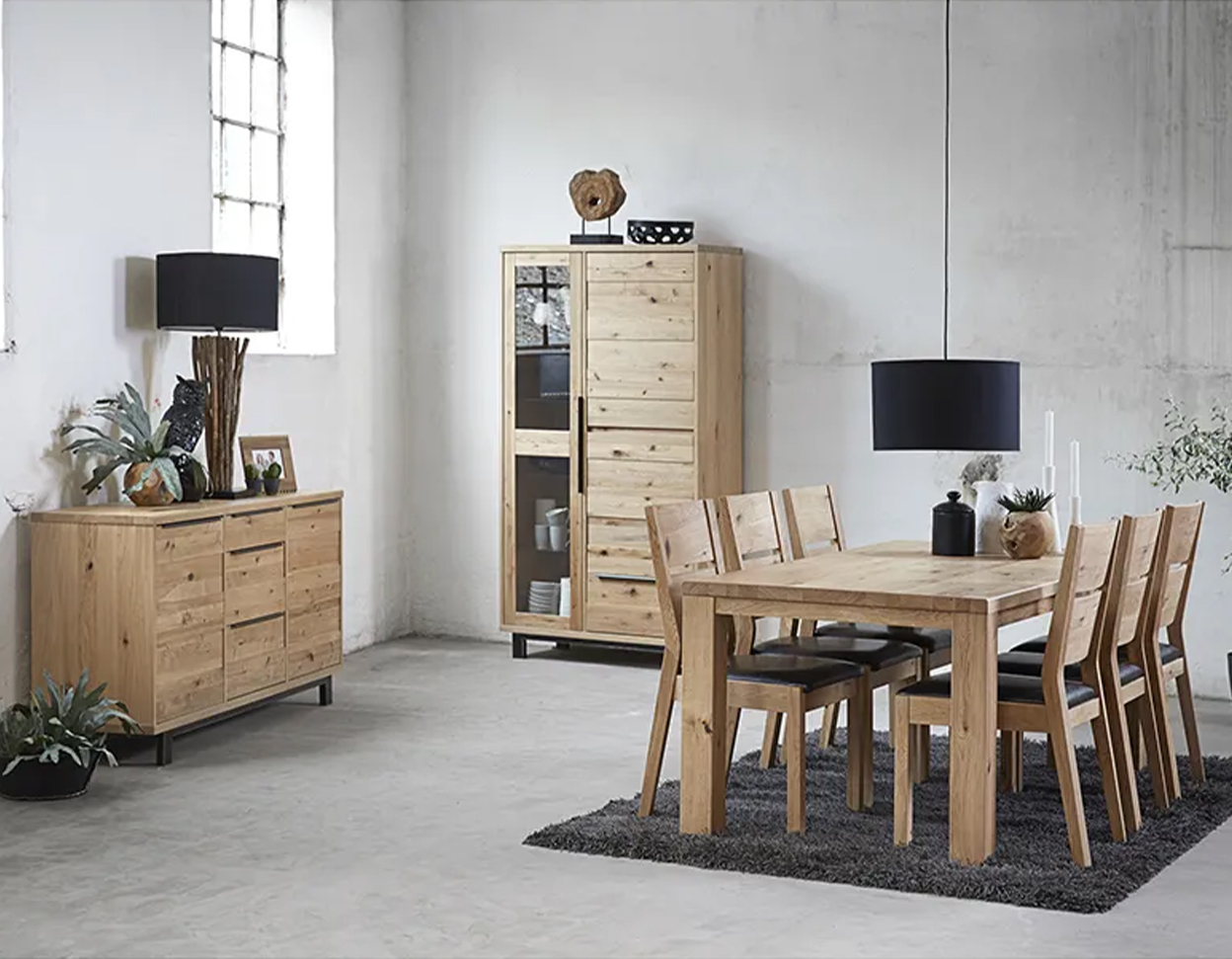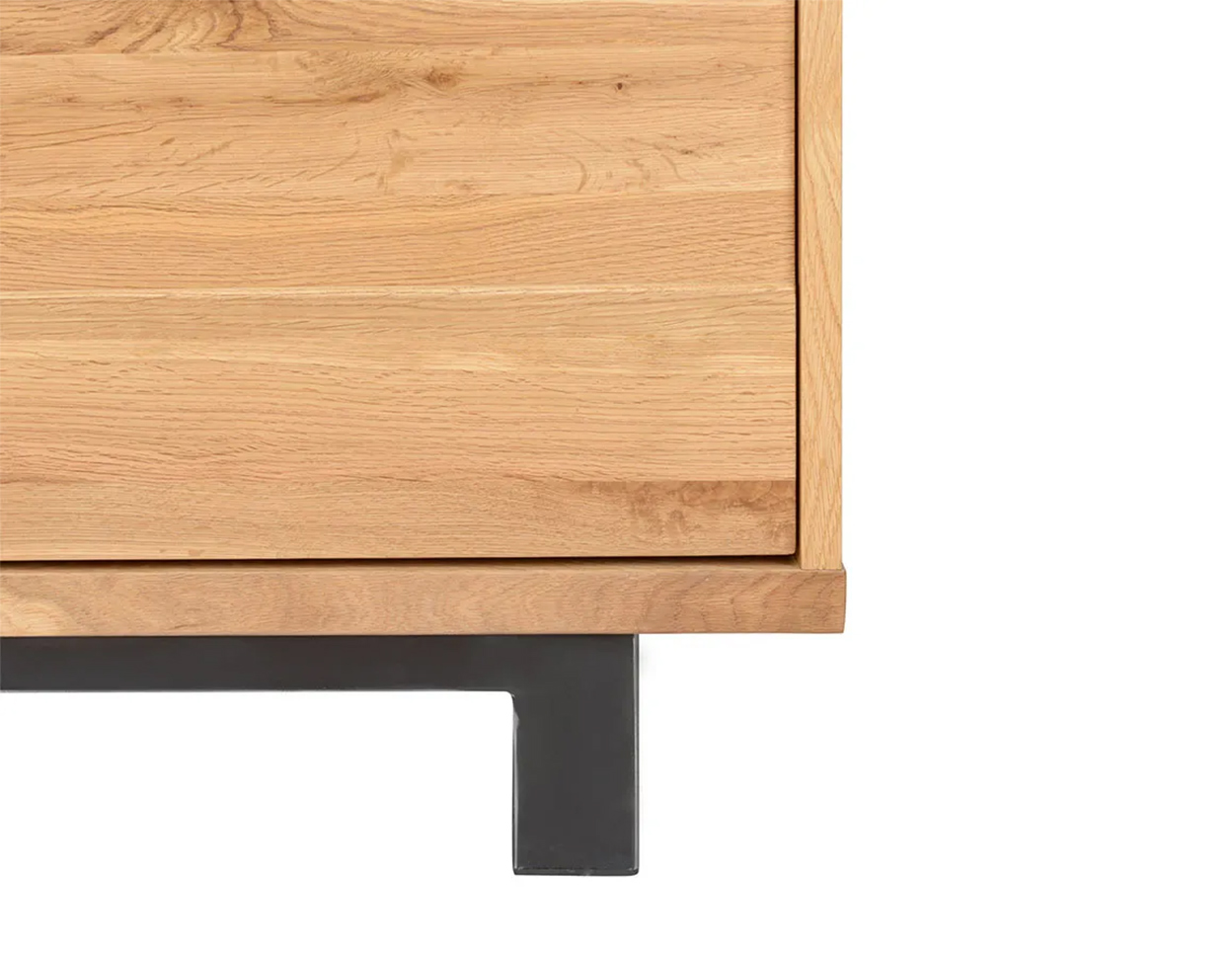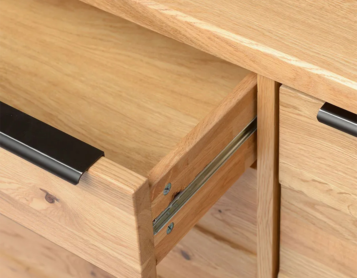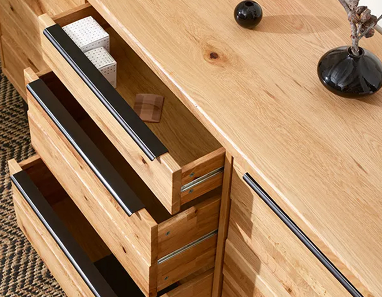 • Sideboard has three drawers and two cabinets with doors, shelves behind doors