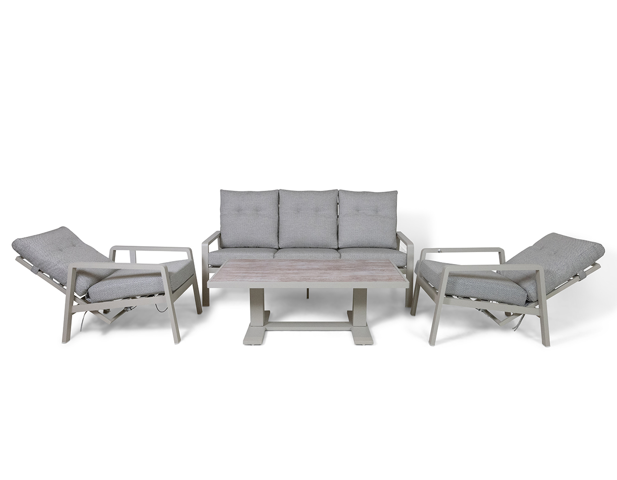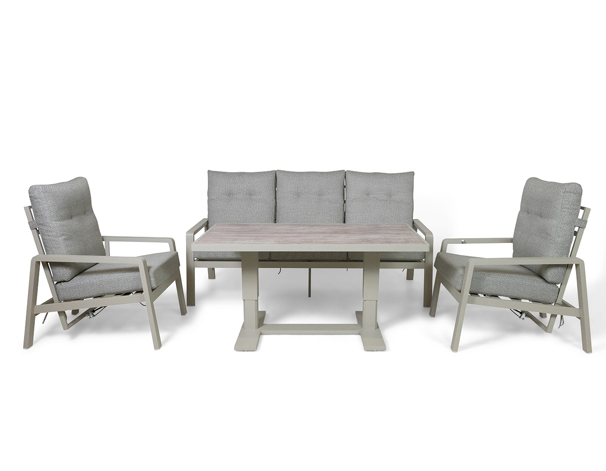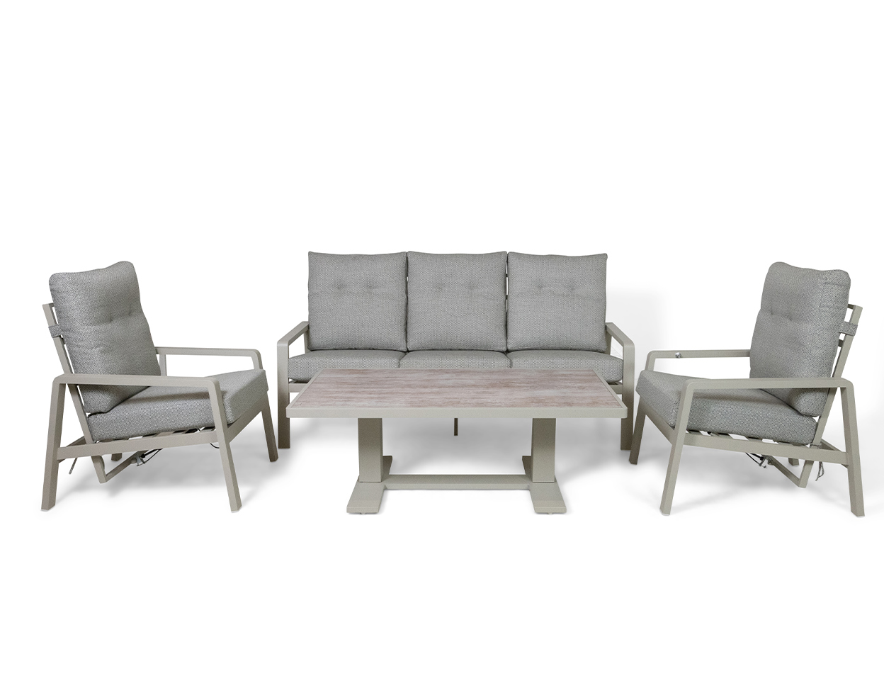 • The set includes a 3-seater sofa, two armchairs and a table with adjustable height