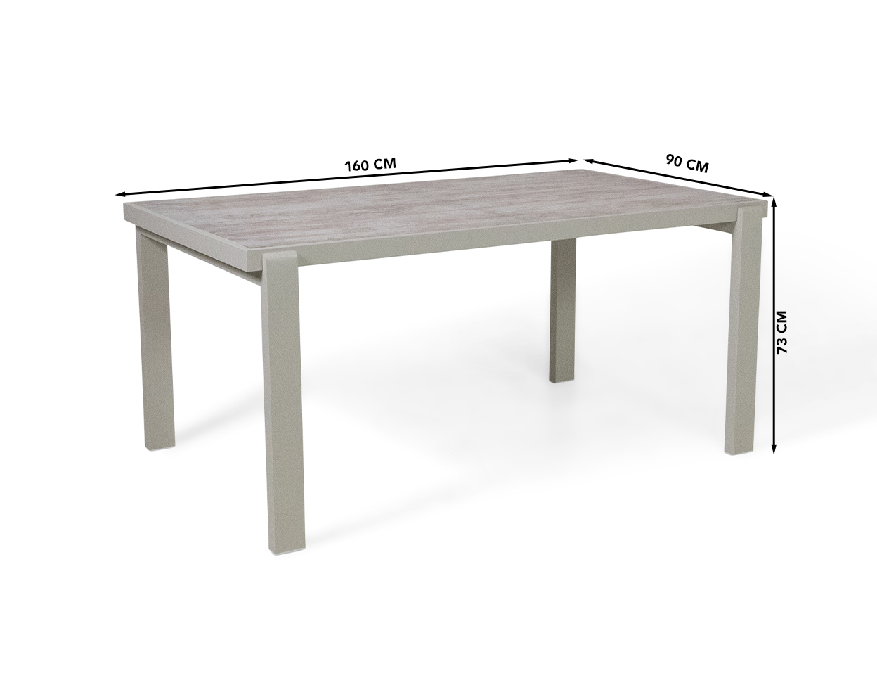 Table dimensions (cm): 160 (W) x 90 (D) x 73 (H)