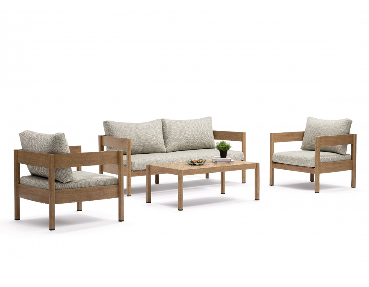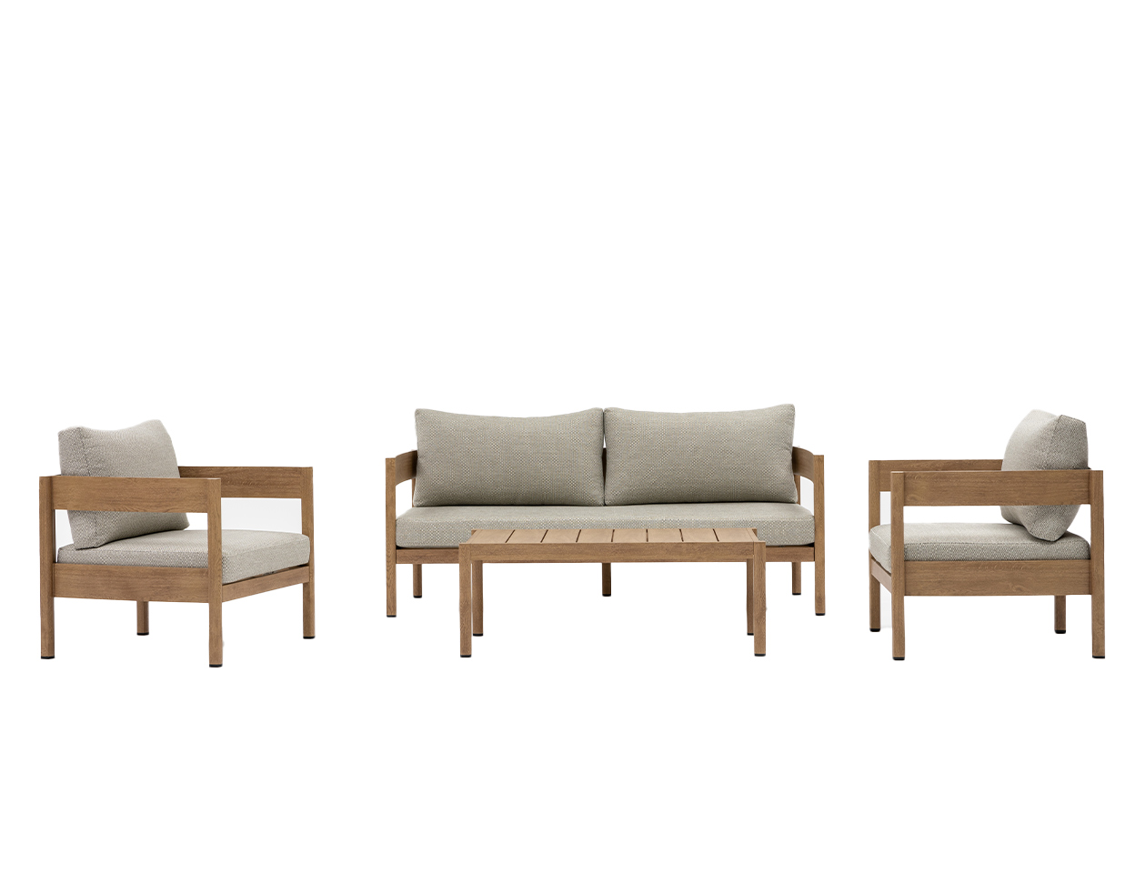 • The set includes a 2-seater sofa, two armchairs and a table