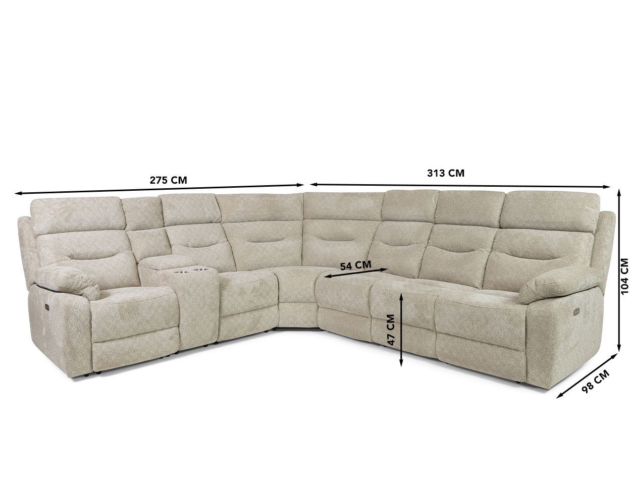 Dimensions (cm): 313 (W) x 275/98 (D) x 104 (H), seat height 47 cm, -depth 54 cm