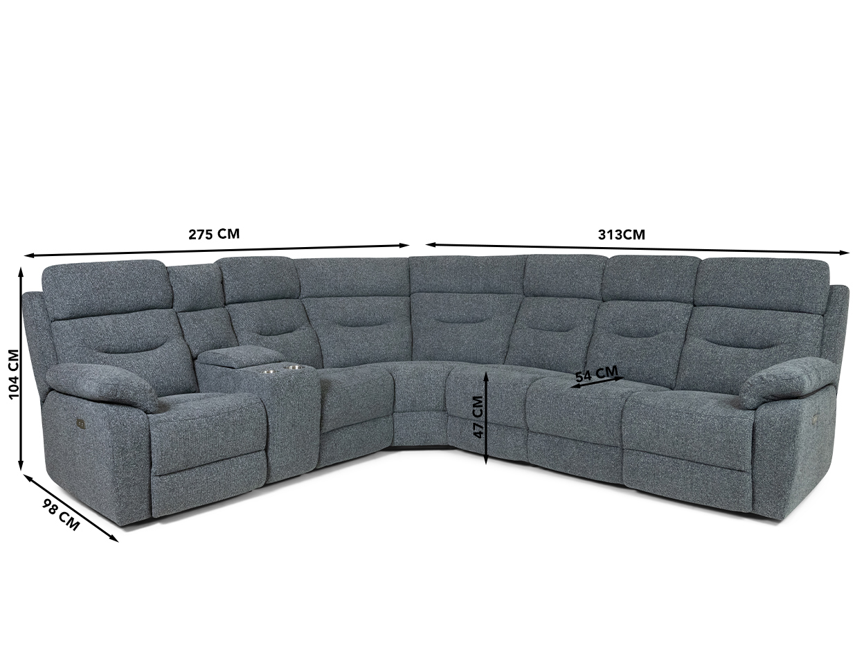 Dimensions (cm): 313 (W) x 275/98 (D) x 104 (H), seat height 47 cm, -depth 54 cm