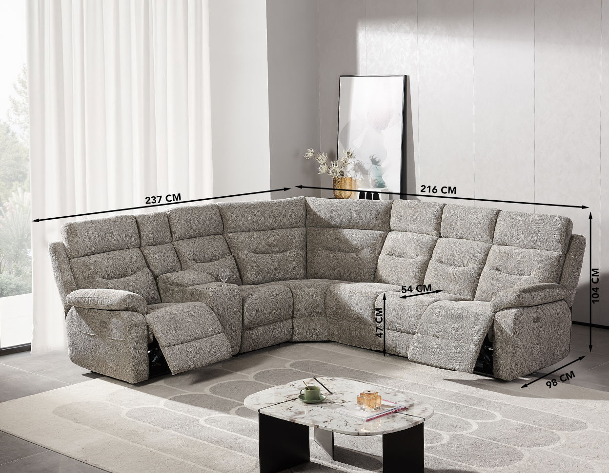 Dimensions (cm): 216 (W) x 237/98 (D) x 104 (H), seat height 47 cm, -depth 54 cm