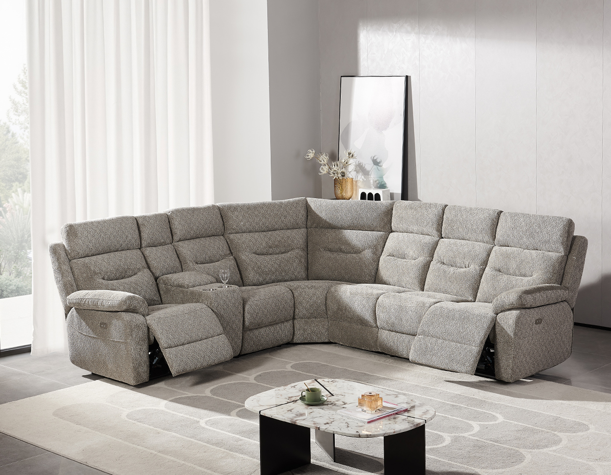 • The sofa has a console module with storage and cup holders