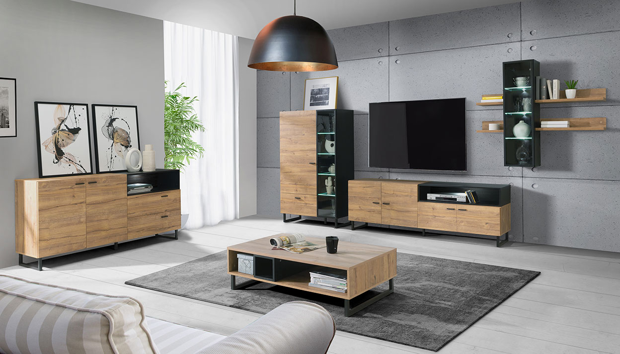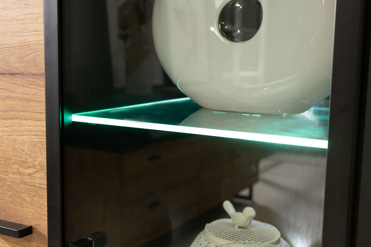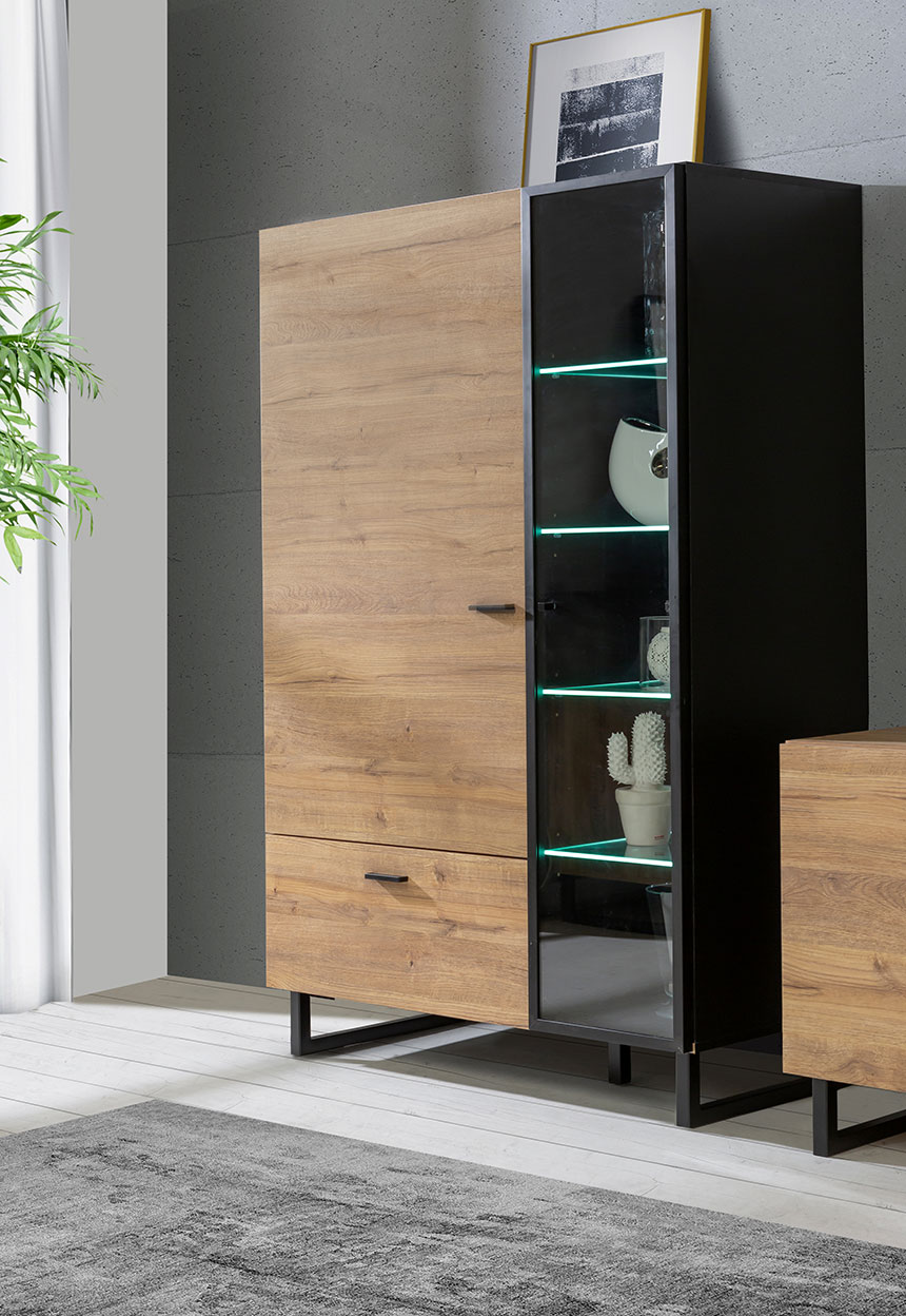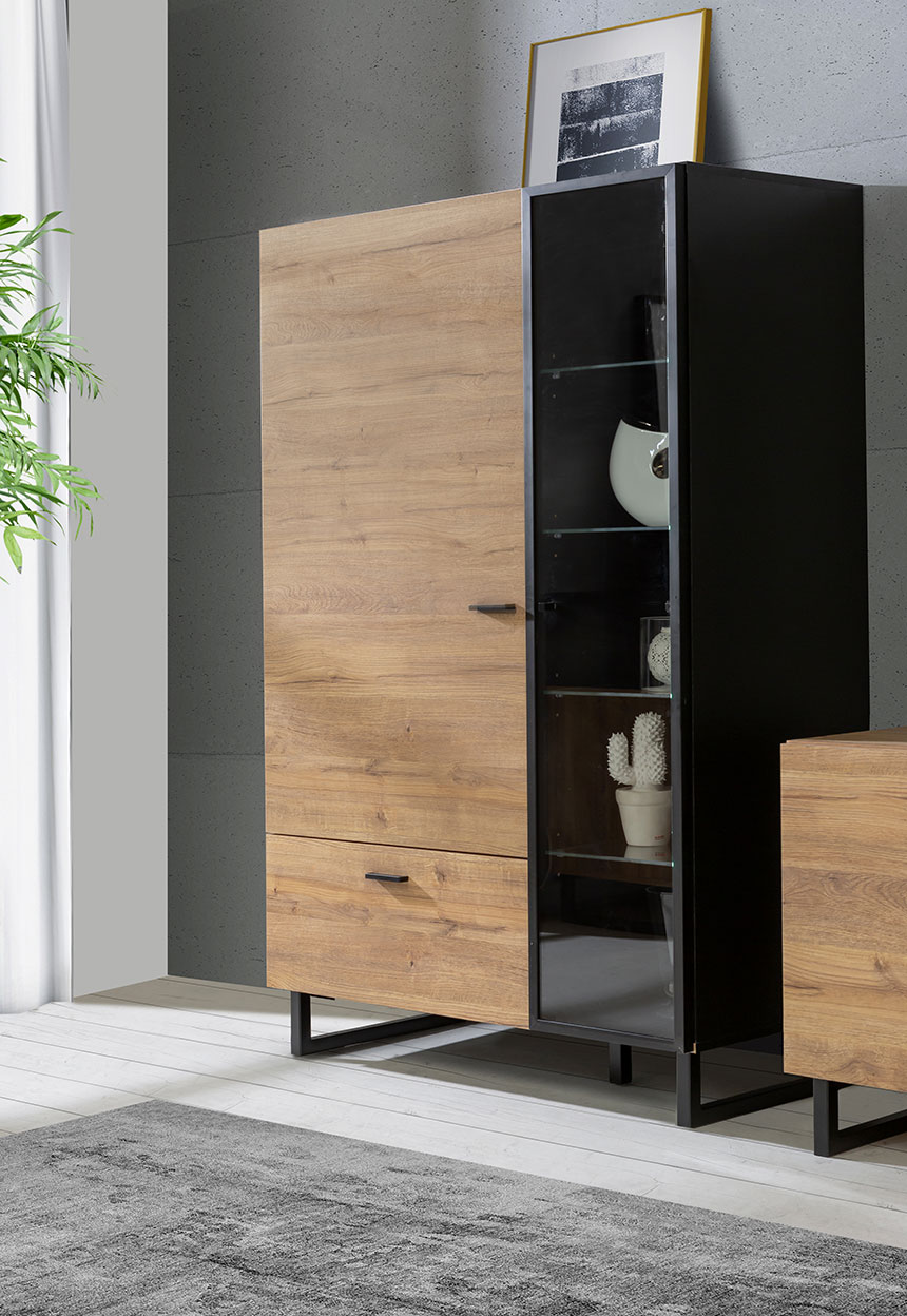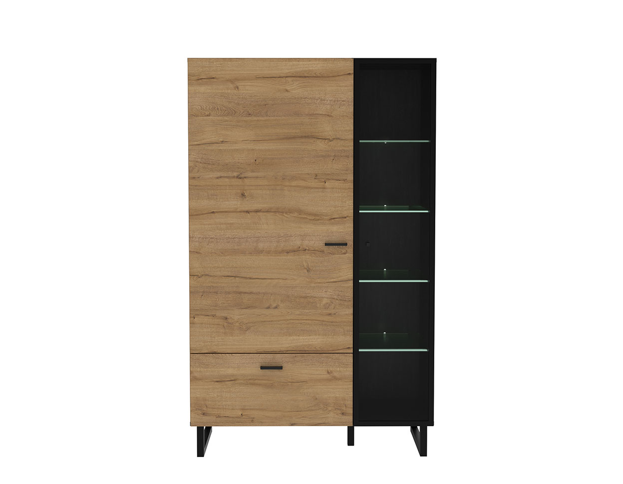 • Display cabinet has 2 cabinets with doors (one door is made of glass), shelves behind doors (behind glass door there are glass shelves)