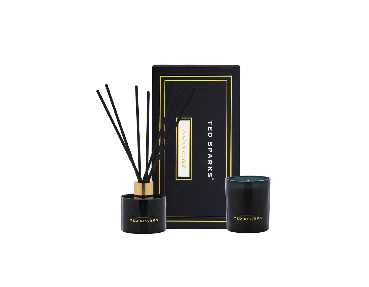 The Ted Sparks Patchouli and Musk Candle and Home Fragrance Gift Set is a stylish gift for yourself or a loved one. The mysterious character of the Ted Sparks Patchouli and Musk Scented Candle and Diffuser brings depth and sensuality to your home, while creating a calming and luxurious atmosphere. A beautiful and perfect unisex scent. Energetic grapefruit top notes lead to a woody heart of sandalwood and dark patchouli. The base notes are pleasantly surprising with warm vanilla, sensual musk, amber and tonka.