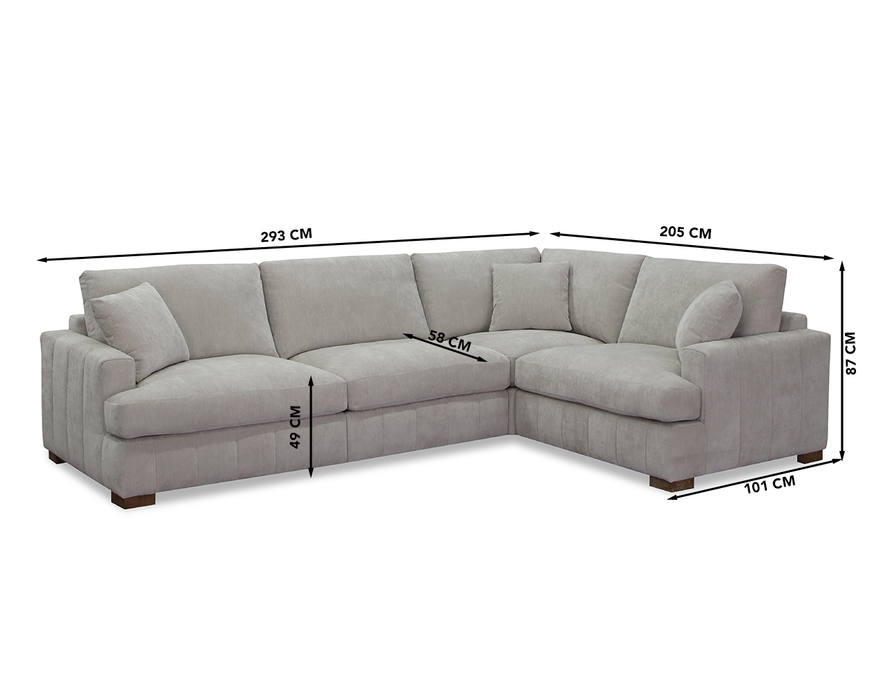Dimensions (cm): 293 (W) x 205/101 (D) x 87 (H), seating height 49 cm, -depth 58 cm
