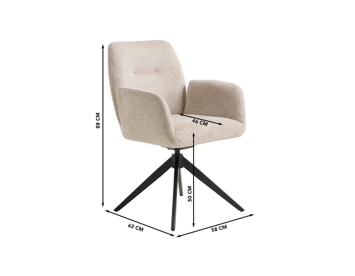 Dimensions (cm): 58 (W) x 62 (D) x 88 (H), seating height 50 cm and – depth 46 cm