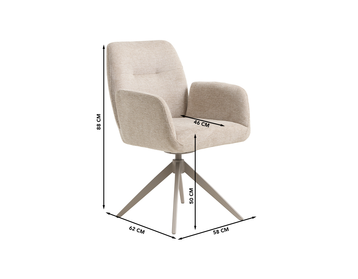 Dimensions (cm): 58 (W) x 62 (D) x 88 (H), seating height 50 cm and – depth 46 cm