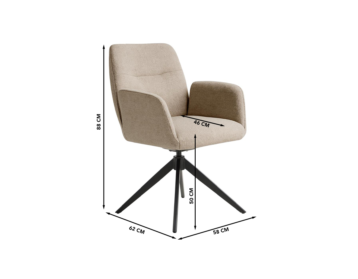 Dimensions (cm): 58 (W) x 62 (D) x 88 (H), seating height 50 cm and – depth 46 cm