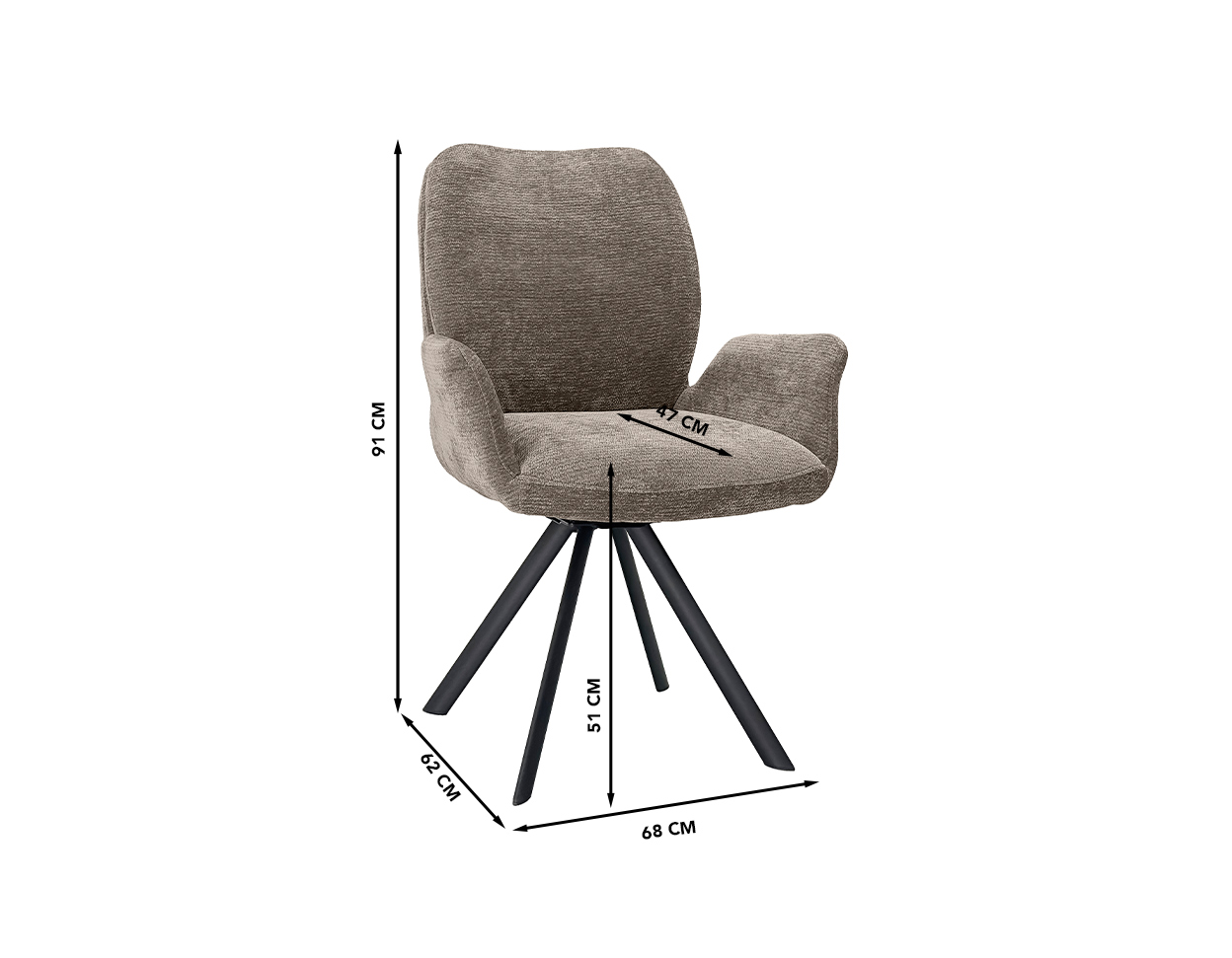 Dimensions (cm): 68 (W) x 62 (D) x 91 (H), seating height 51 cm and – depth 47 cm