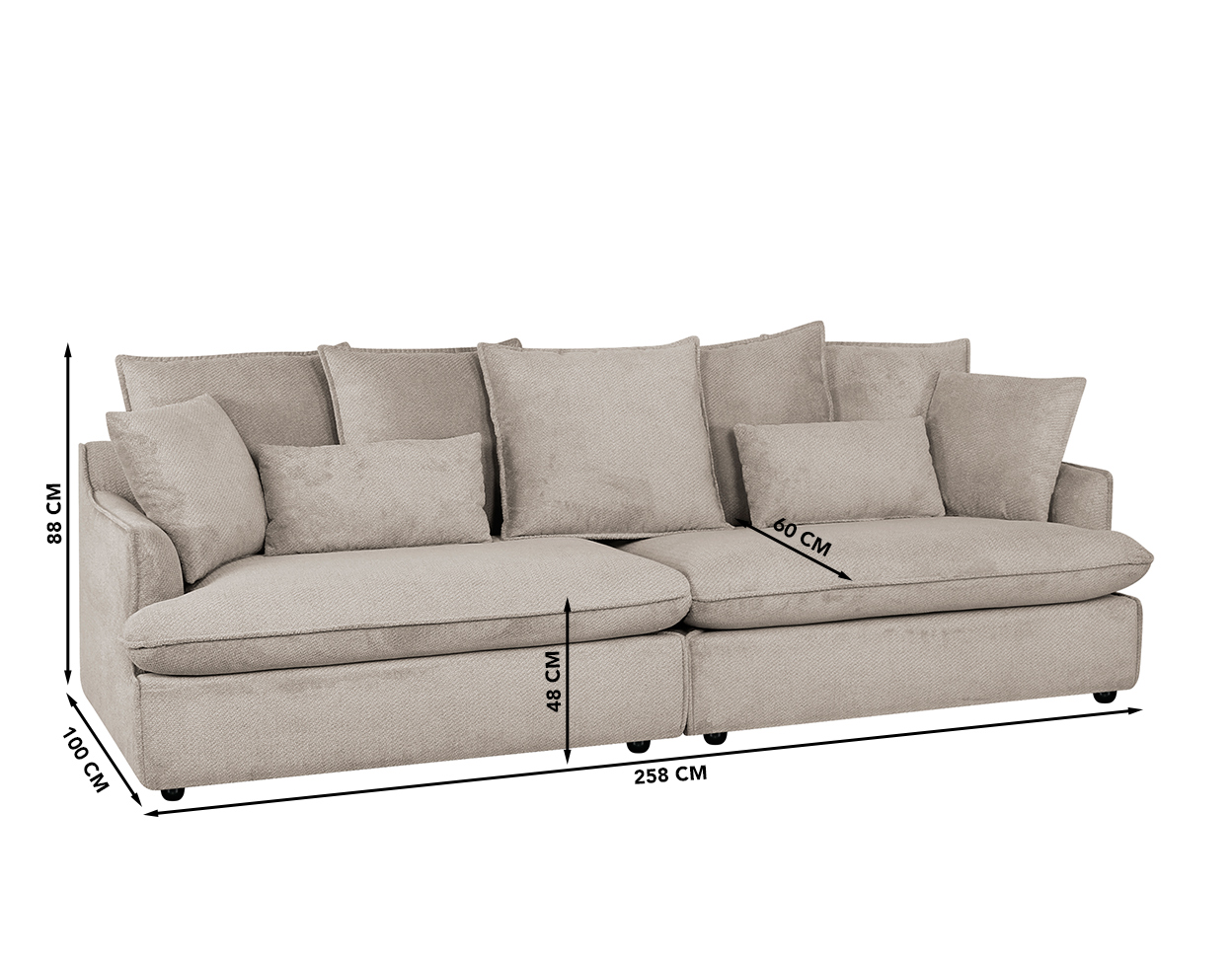 Dimensions (cm): 258 (W) x 100 (D) x 88 (H), seat height 48 cm, -depth 60 cm