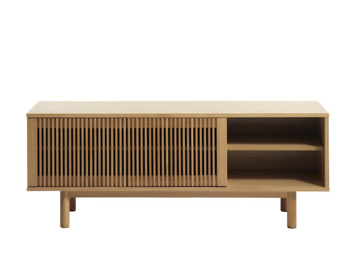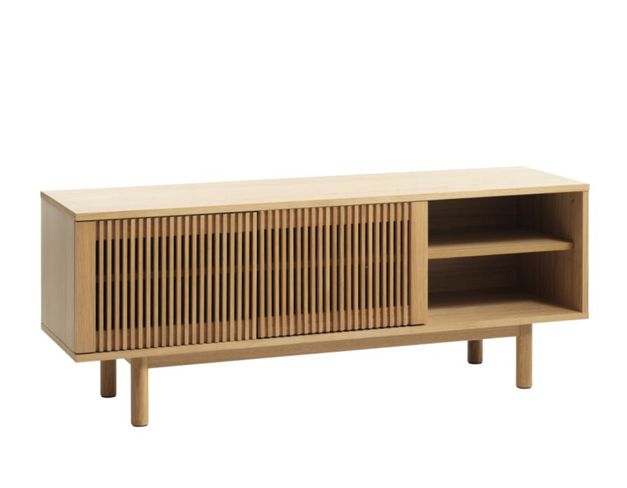 • TV-stand has cabinet with doors, shelves behind them, also open shelves