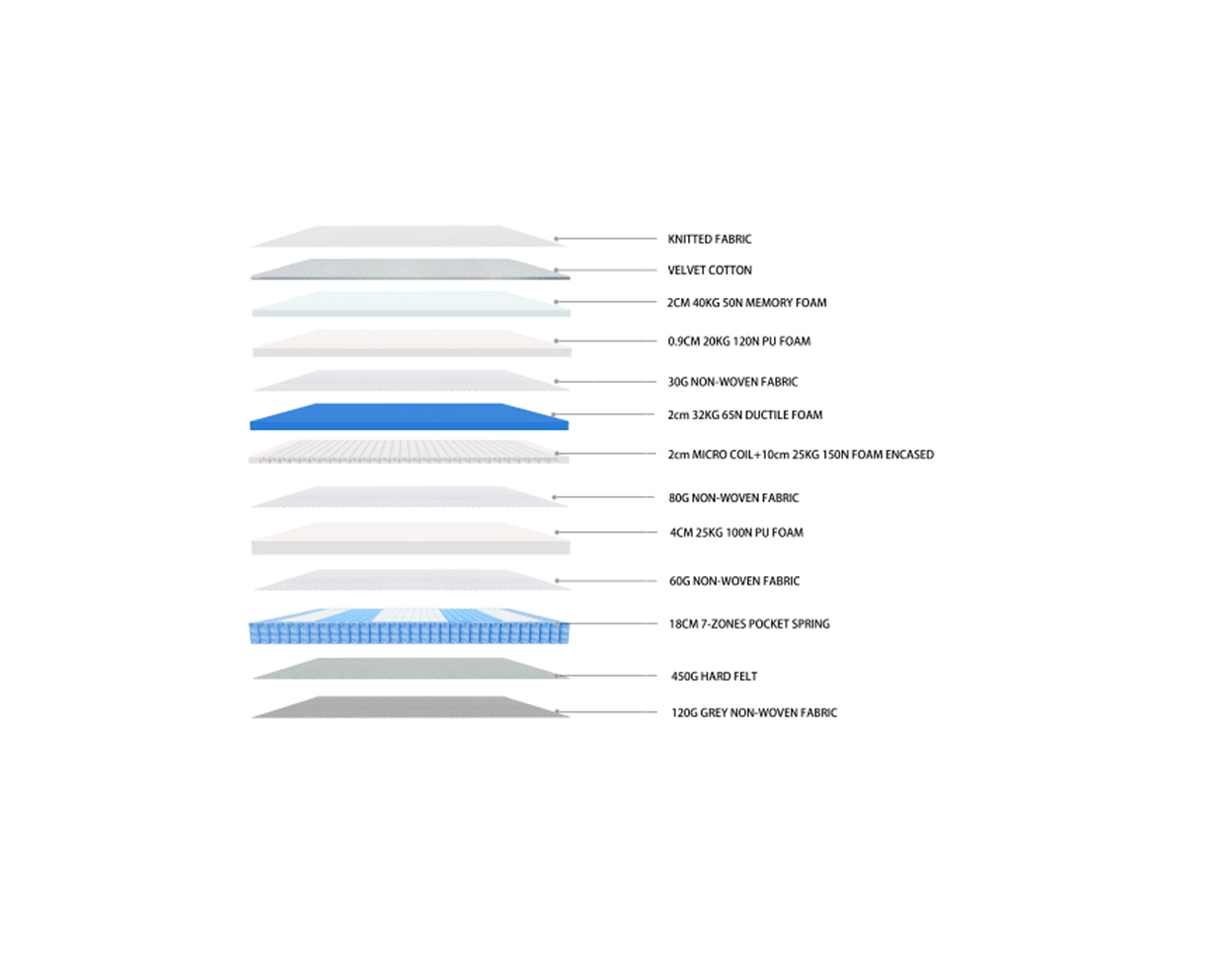 • Felt, foam, batting, pocket springs and memory foam are used in the layers of the mattress (more detailed layers are shown in the picture)