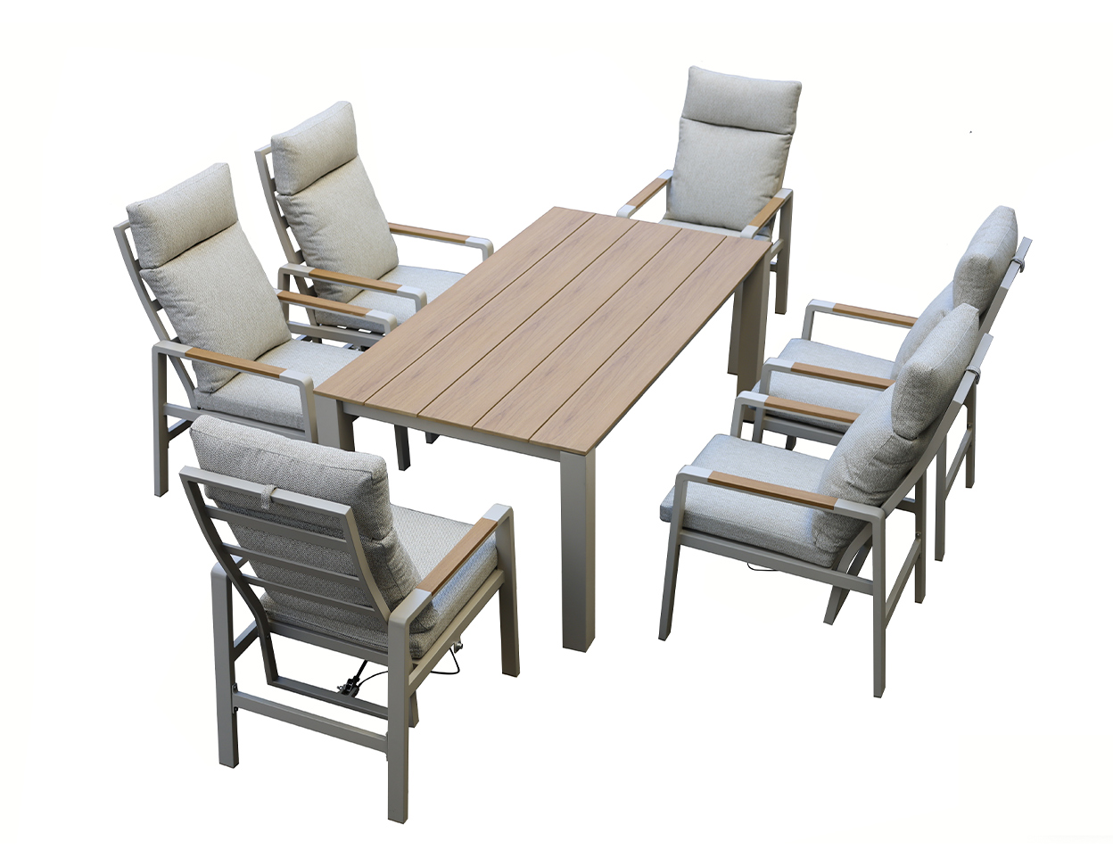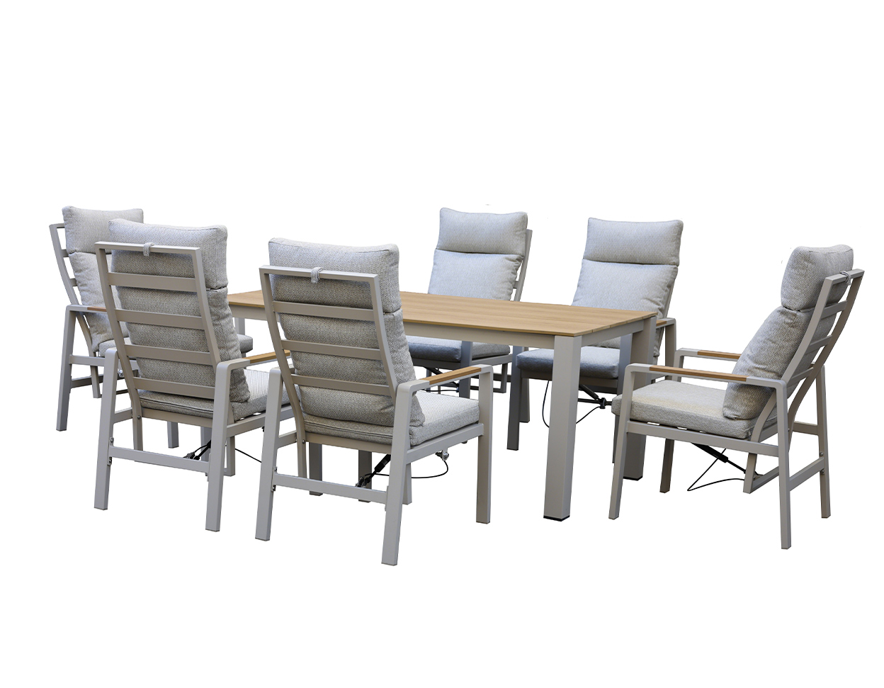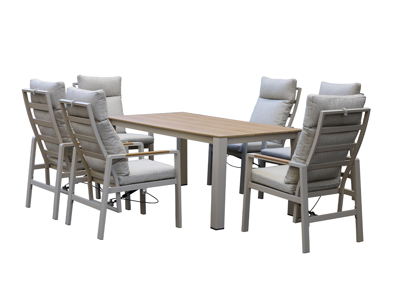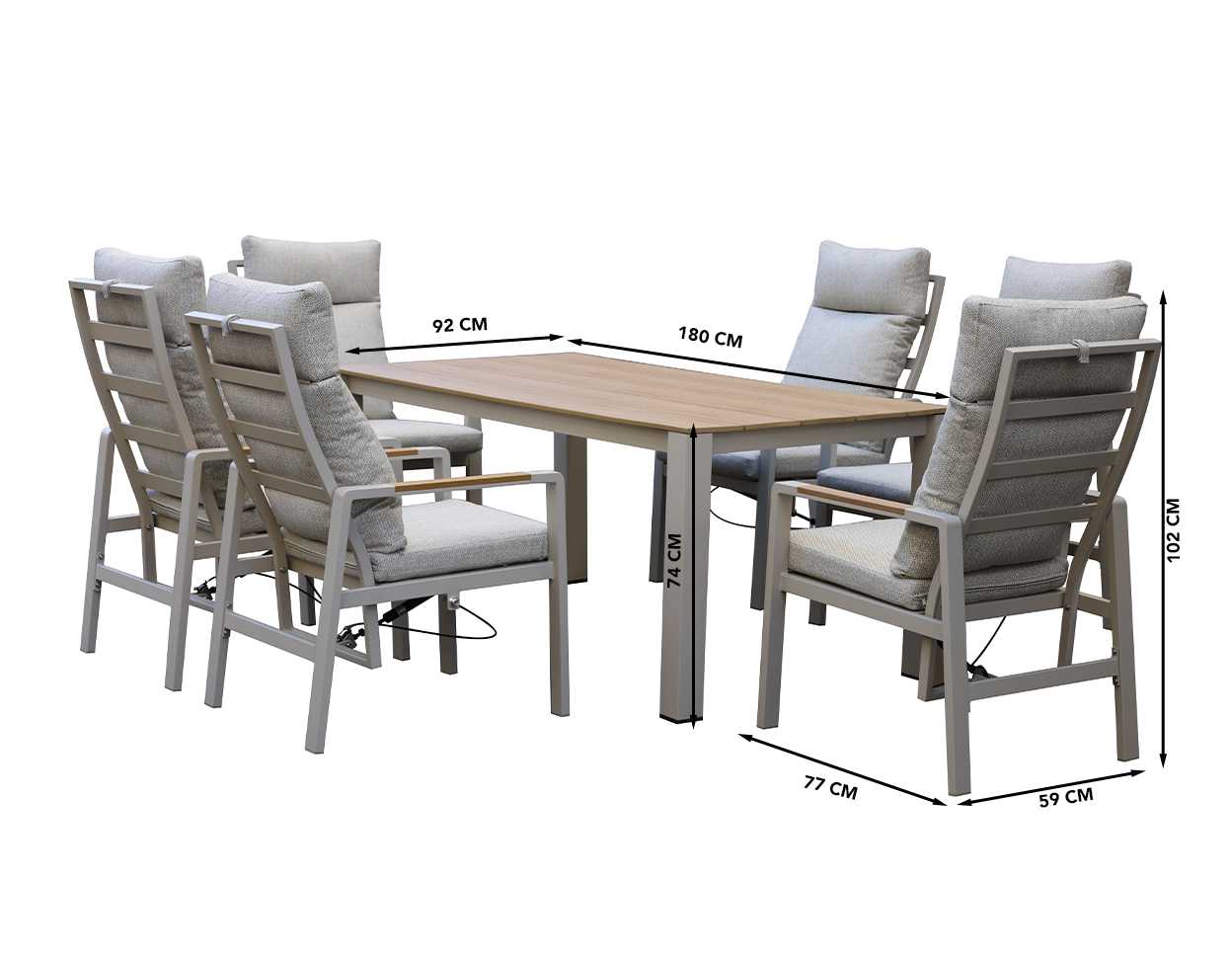• Komplekti kuulub laud ja 6 recliner funktsiooniga tooli (seljatugi käib elektriliselt lamavasse asendisse)