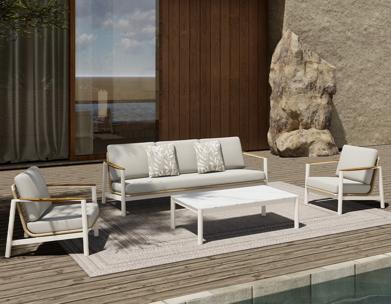 • Diivan ja tugitoolid on kaetud vetthülgava ja UV-kindla polüesterkangaga
