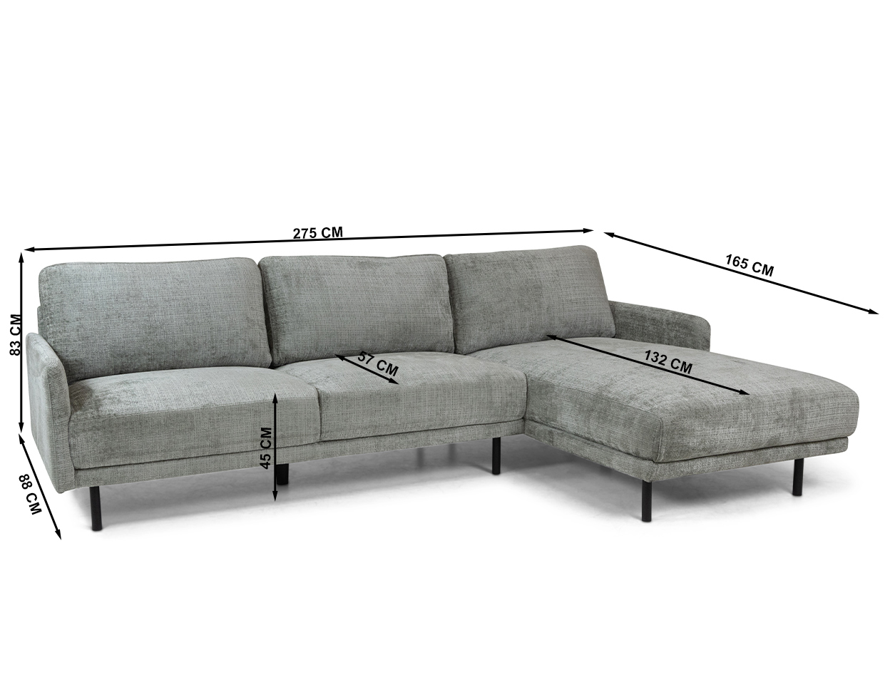 Mõõdud (cm): 275 (L) x 88/165 (S) x 83 (K), istumiskõrgus 45 cm, -sügavus 57/132 cm