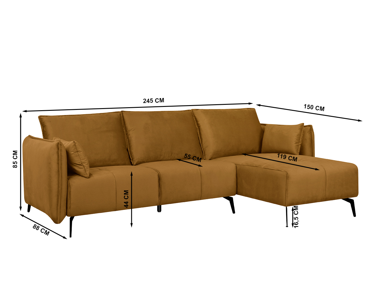 Mõõdud (cm): 245 (L) x 88/150 (S) x 85 (K), istumiskõrgus 44 cm, -sügavus 55/119