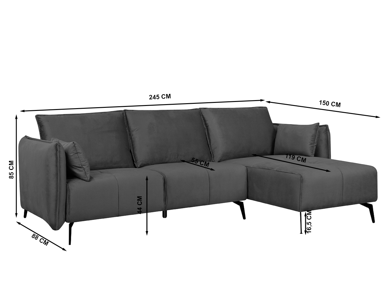 Mõõdud (cm): 245 (L) x 88/150 (S) x 85 (K), istumiskõrgus 44 cm, -sügavus 55/119