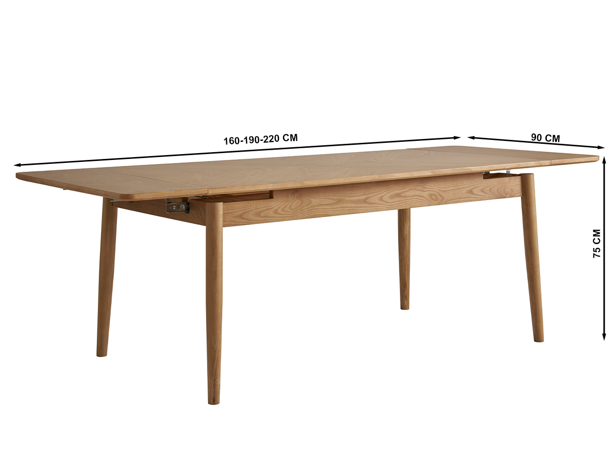 • Söögilaud on pikendatav (pikendamata kujul pikkus 160 cm), lisades ühe pikendusplaadi on laua pikkus 190 cm, lisades kaks plaati on laua pikkus 220 cm