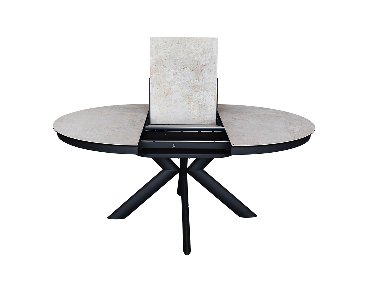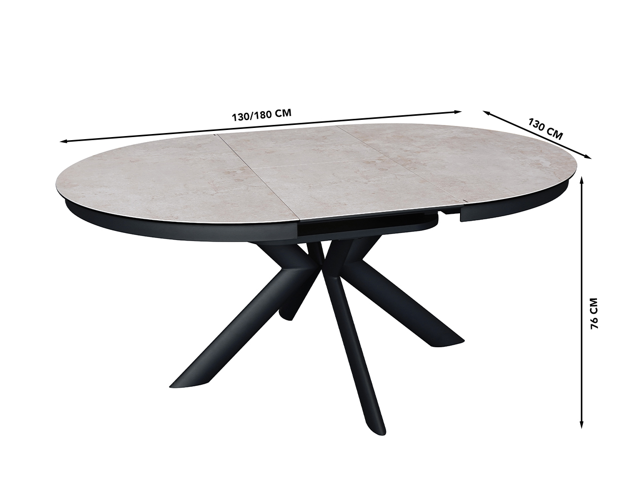 • Pikendatav (ilma pikendusplaatideta on laud ümar, läbimõõduga 130cm, keskele käib pikendusplaat ja selle lisamisel on laua pikkus 180cm)