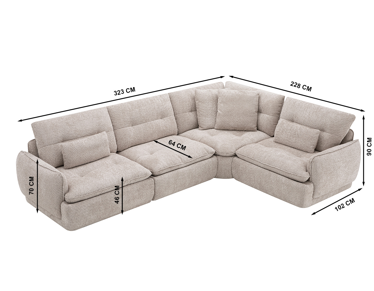 Mõõdud (cm): 323 (L) x 228/102 (S) x 90/70 (K)