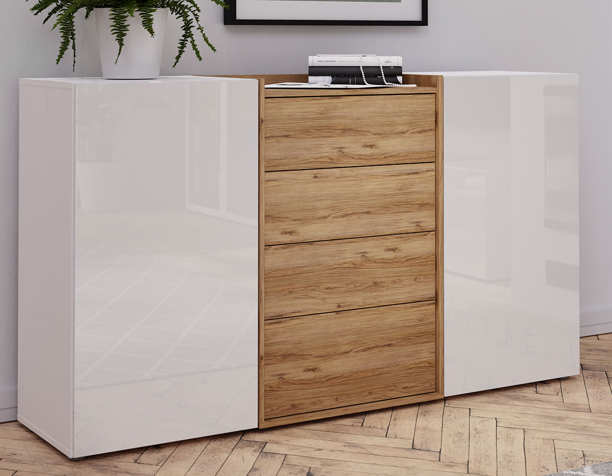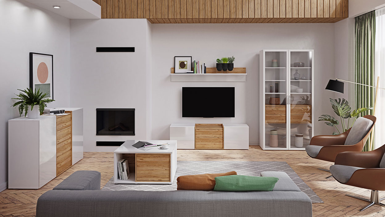 • Uste esipaneelid on valge kõrgläikega ja sahtliosa Catania tamm imitatsiooniga