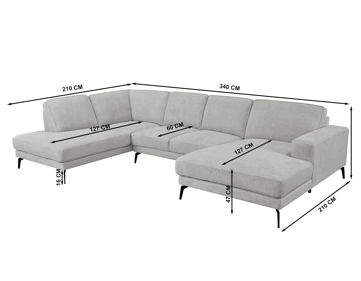 Mõõdud (cm): 340 (L) x 210/170 (S) x 84 (K), istumiskõrgus 47 cm, -sügavus 167/60/127 cm