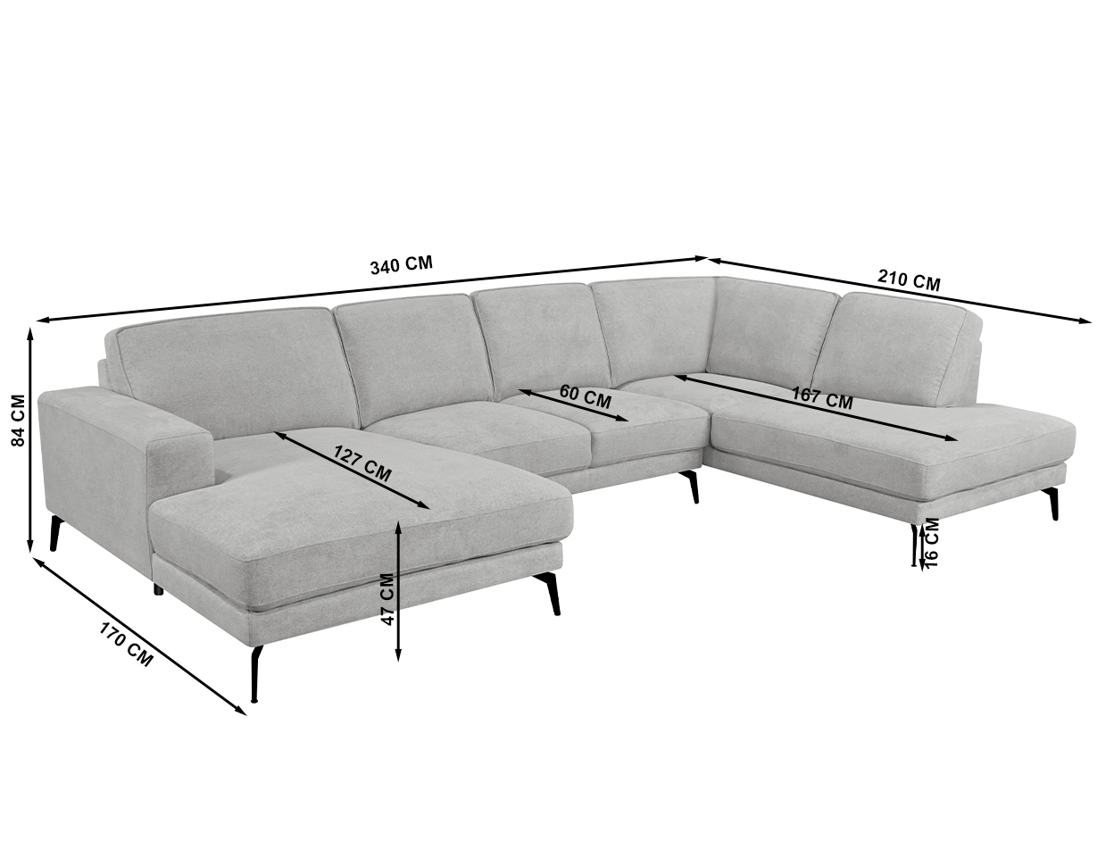 Mõõdud (cm): 340 (L) x 170/210 (S) x 84 (K), istumiskõrgus 47 cm, -sügavus 127/60/167 cm
