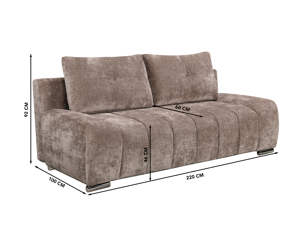 Mõõdud (cm): 220 (L) x 100 (S) x 92 (K), istumiskõrgus 46 cm, -sügavus 60 cm