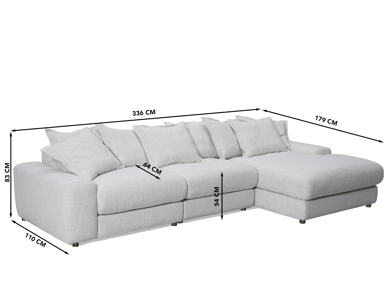 Mõõdud (cm): 336 (L) x 110/179 (S) x 83 (K), istumiskõrgus 54 cm, -sügavus 64 cm