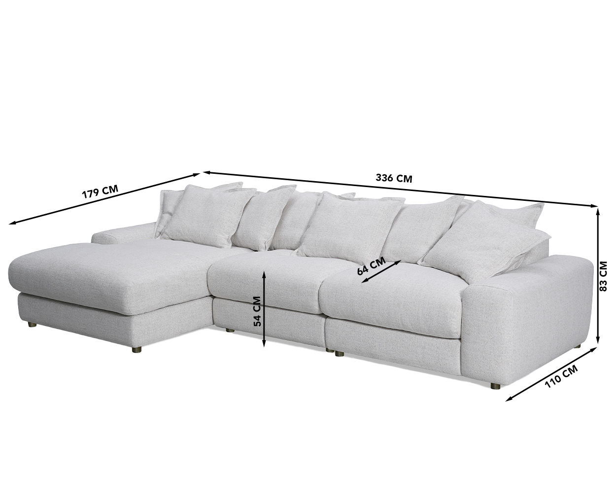 Mõõdud (cm): 336 (L) x 179/110 (S) x 83 (K), istumiskõrgus 54 cm, -sügavus 64 cm