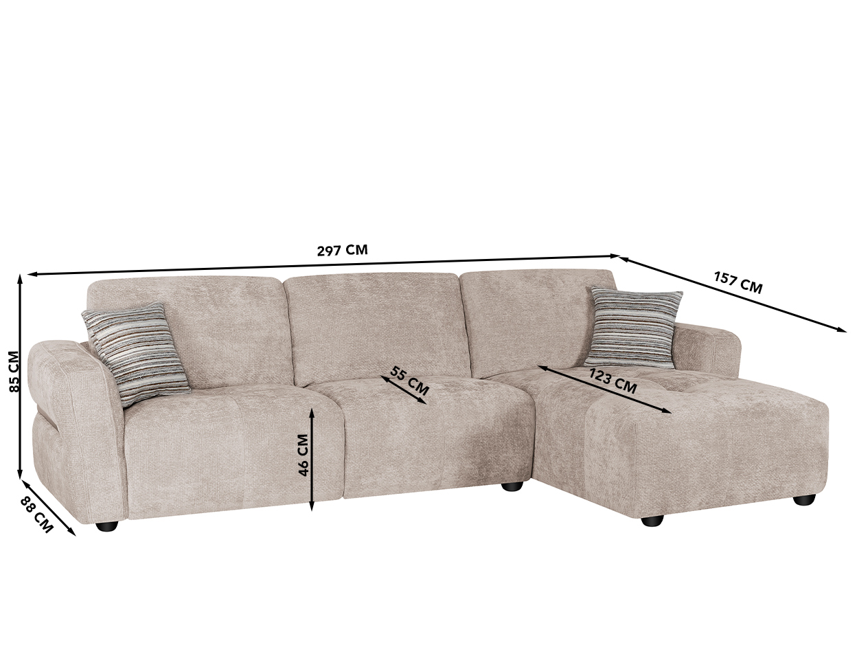 Mõõdud (cm): 297 (L) x 88/157 (S) x 85 (K), istumiskõrgus 46 cm, -sügavus 55/123 cm
